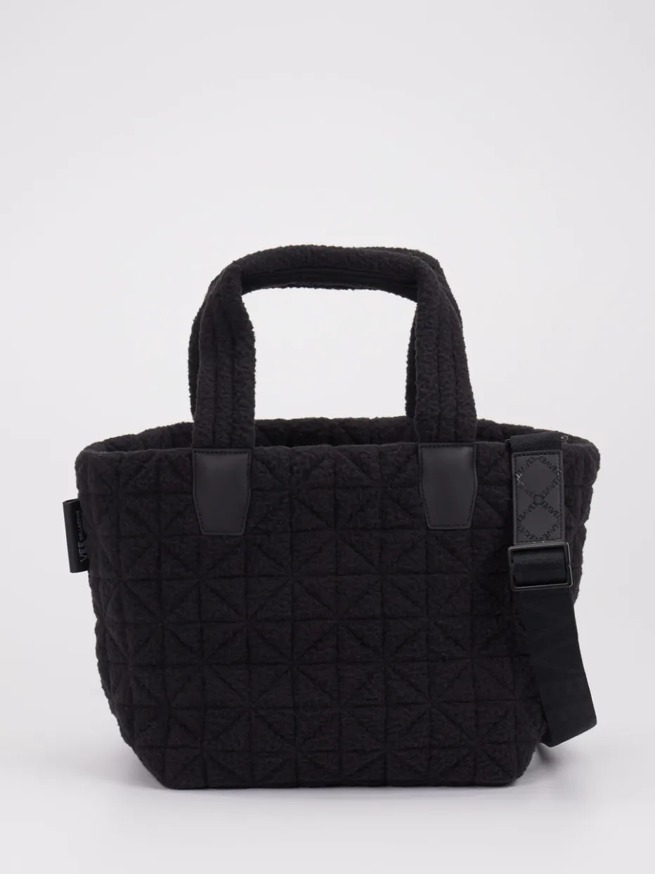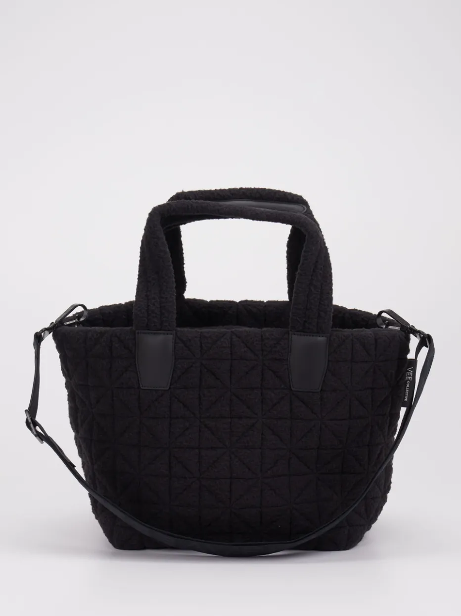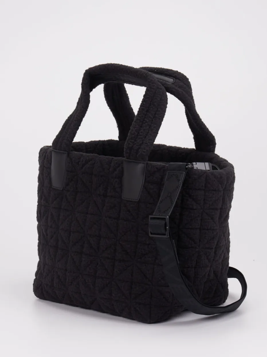 Weich, urban, alltagstauglich. Mit dieser Shopper Bag bringt VeeCollective Berlin eine stylishe Variante der Schulter- und Umhängetasche auf den Punkt. Der weich strukturierte, wasserabweisende Textilkörper in schwarzer Steppoptik vermittelt ein angenehm gepolstertes Tragegefühl – ideal für Freizeit und City. Kunstlederdetails an Griff und Riemen sorgen für Stabilität, während das Nylonfutter und der Reißverschluss praktisch durchdacht sind. Rechteckige Form, dezentes Logo am Gurt und ein verstellbarer Schulterriemen unterstreichen den unaufgeregt urbanen Charakter. Teddy-Texturen und Soft Utility machen die Tasche zu einem Fashion-Update für kuschelige Looks. VeeCollective verbindet Funktion, Design und ein modernes Gespür für Alltagstauglichkeit – garantiert vegan.