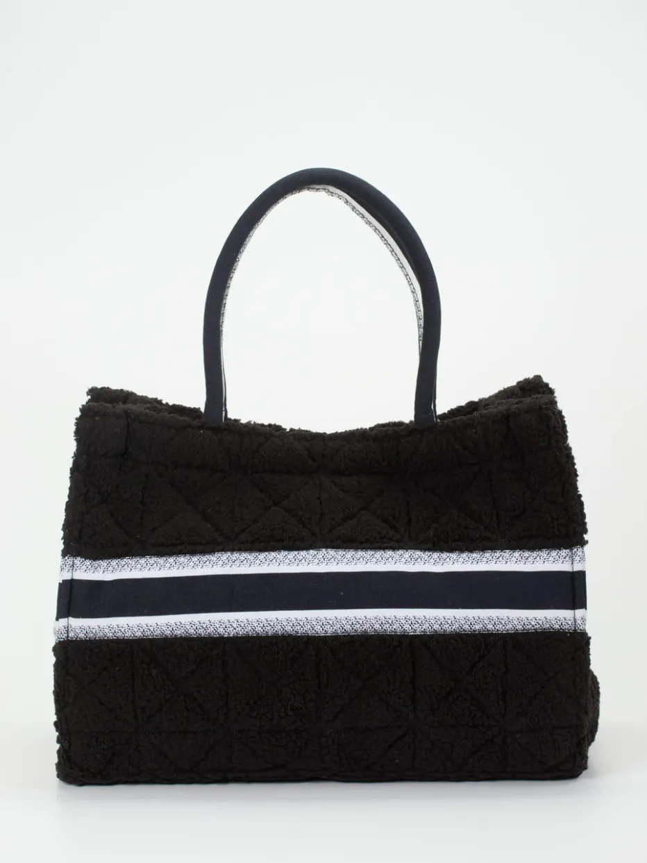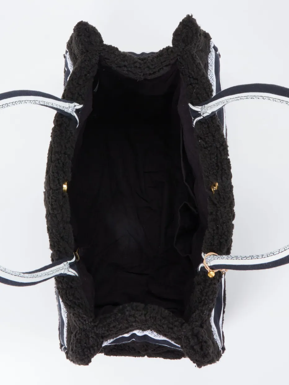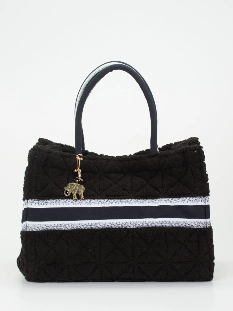 Dieser verspielte Shopper wird von der Marke Anokhi präsentiert. Richtig kuschelig kommt das schwarze Plüsch-Design aus Polyester daher und wird durch einen markanten, schwarzweißen Streifen in Szene gesetzt. Im Innenraum findet sich ausreichend Platz für all Ihre Essentials. Markentypisch zeigt sich der abnehmbare, mit Perlen und Glöckchen verzierte Elefanten-Anhänger. Ein sympathischer Begleiter für Ihren Alltag!
