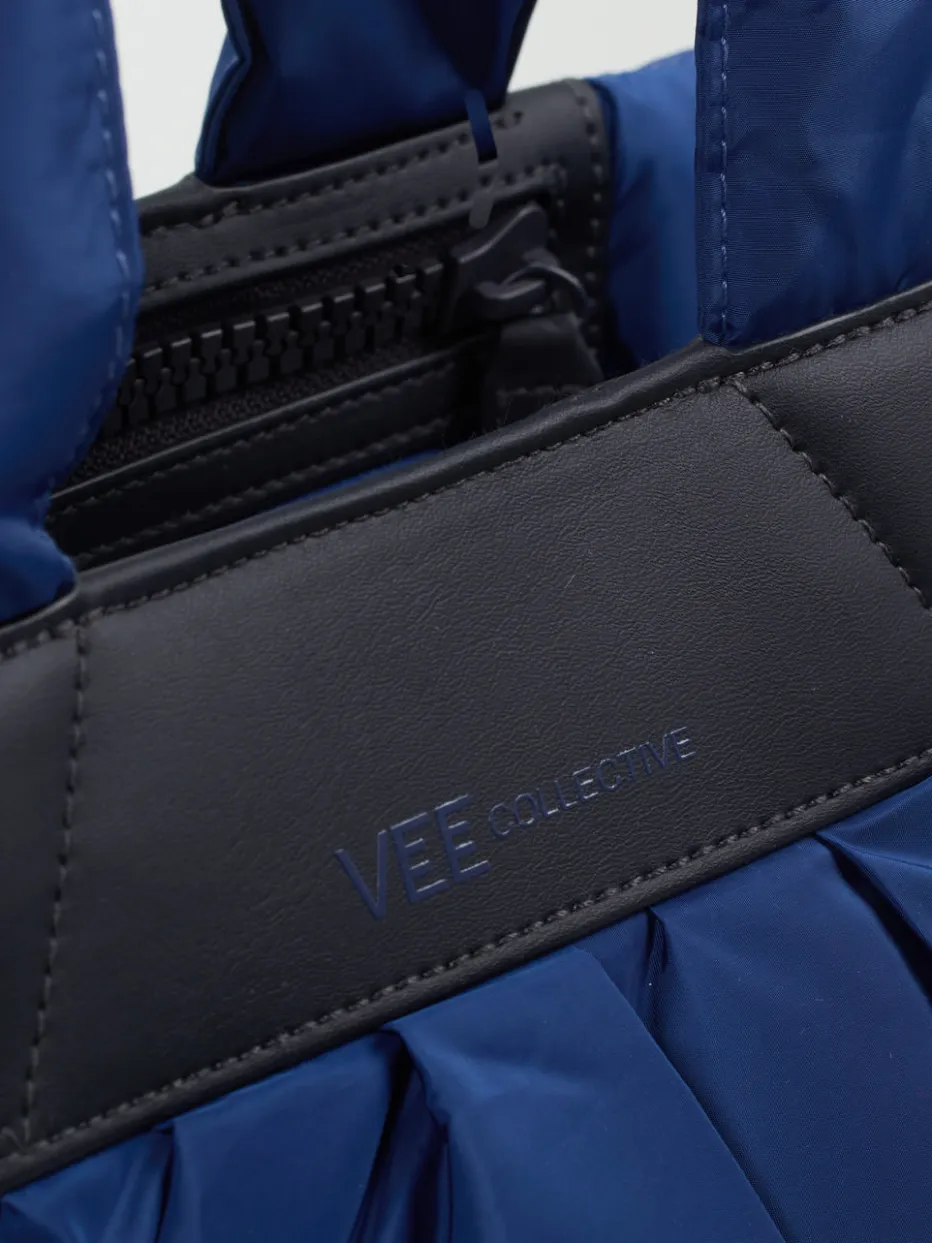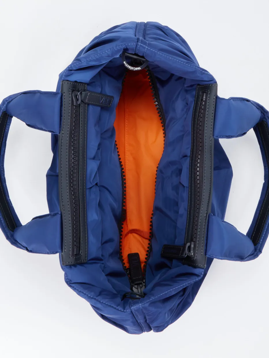 Dieser modische Shopper kommt von der Marke VeeCollective Berlin. Das blaue Ripstop Nylon zeigt sich matt glänzend und wird am oberen Rand unter dem tonigen, veganen Kunstleder-Element sowie an der Unterseite feminin gerafft. Hier zeigt sich unverkennbar der Markenname. Das recycelte Nylon ist wasserabweisend und überzeugt mit seiner unnachahmlichen Leichtigkeit und Robustheit. Die weichen Riemen sowie der geräumige, orangefarbene Innenraum mit den beiden Seitentaschen und vielen Fächer versprechen angenehmen Komfort und ausreichend Platz. Mit dem längeren Gurt können Sie die Tasche auch bequem über der Schulter tragen. Der ideale Begleiter für den Tag im Büro oder einen Stadtbummel! – Obermaterial: Ripstop Nylon – Futter: Textil – Farbe: Blau – Größe: ca. 30 x 40 x 15 cm (H x B x T) – Schulterriemen: max. ca. 100 cm, abnehm-und verstellbar – Henkel: ca. 50 cm – Verschluss: Reißverschluss – Innen: ein Reißverschlussfach, drei Steckfächer – Außen: zwei Reißverschlussfächer …