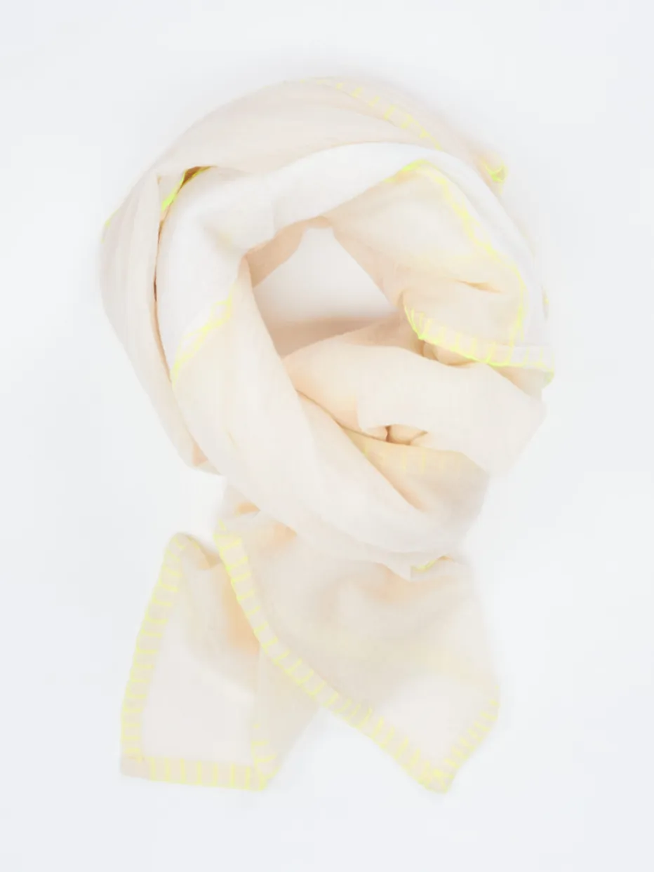 Ein luxuriös-leichter Kaschmirschal mit feiner Transparenz, der durch eine neonfarbene Kontrastnaht stilvolle Akzente im Sommerlook setzt.