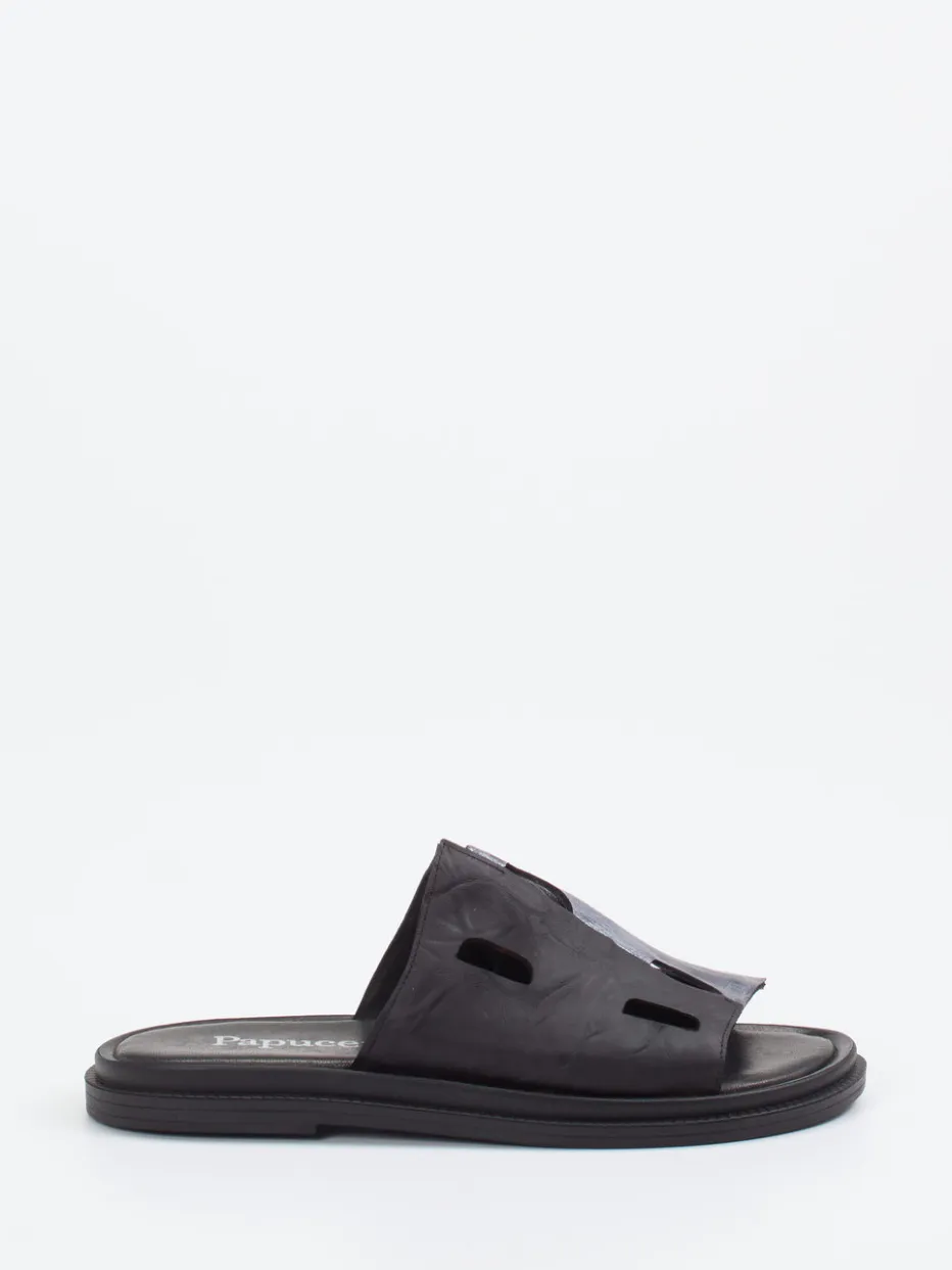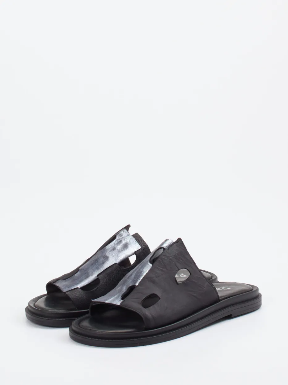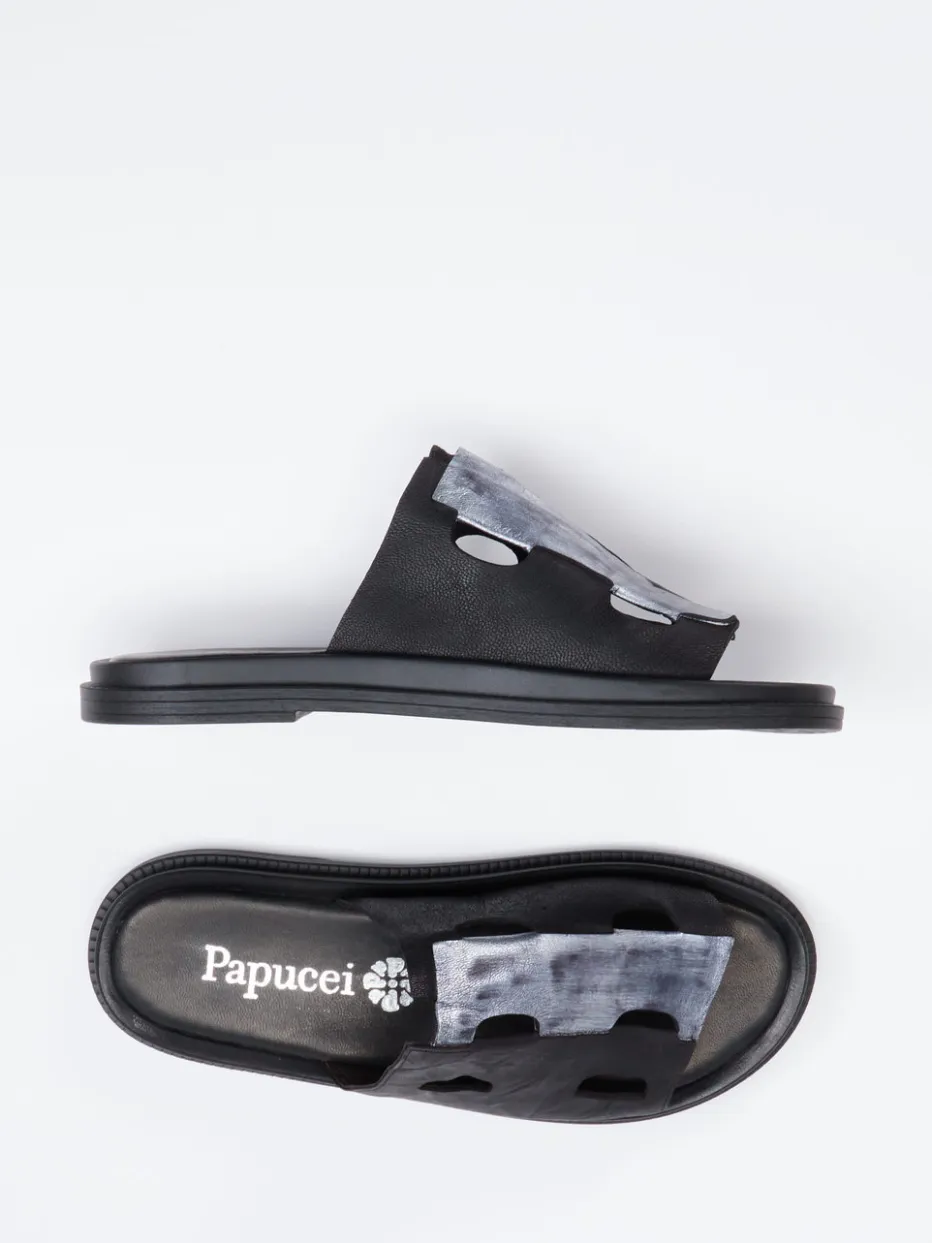Puristische Extravaganz für warme Tage.Papucei interpretiert die klassische Damen-Slide neu. Diese Pantolette kombiniert schwarzes Känguruleder mit einem silberfarbenen Metallic-Einsatz im Used-Look. Die flache Schlupfform mit asymmetrischem Deckriemen und Cut-Outs bietet nicht nur Komfort, sondern auch optische Raffinesse. Die gepolsterte Innensohle aus Leder verschmilzt mit einer flexiblen Gummisohle samt leichtem Absatz, ideal für entspannte Stadtbummel und stilvolle Urlaubsmomente. Die edlen Metallic-Akzente setzen einen trendbewussten Akzent, inspiriert von „Quiet Luxury“ und der AW24-Metallic-Welle. Kombiniert mit Leinenhose und Metallic-Bag entsteht ein vielseitiger City-Look. Form, Finish und Tragegefühl – ein charakterstarker Schuh im typischen Papucei-Stil.
