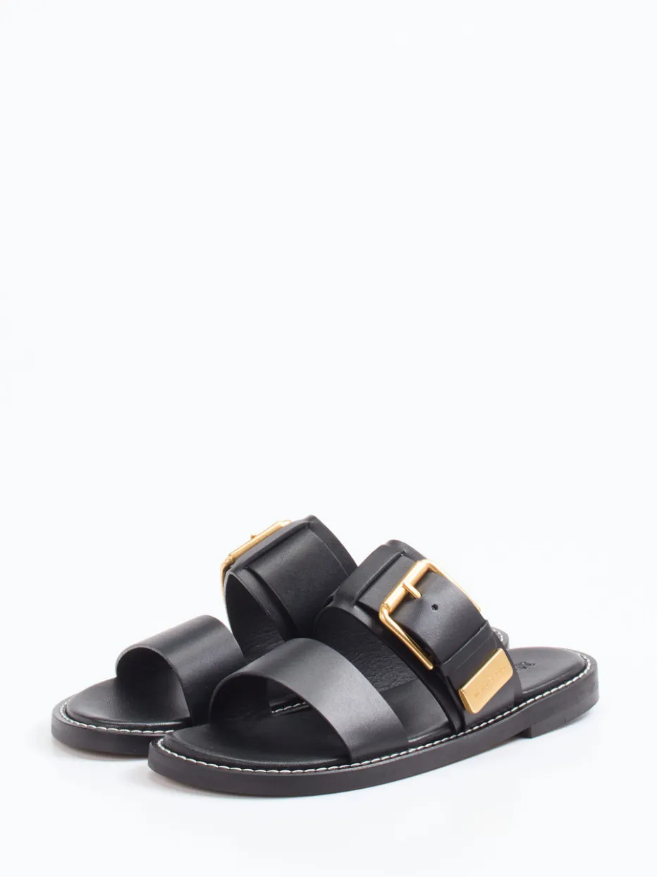 Schlichte Eleganz trifft sommerliche Leichtigkeit.Marc O’Polo präsentiert mit diesen Damen-Slides eine stilvolle Ergänzung für moderne Freizeit-Outfits. Für entspannte City-Tage oder Urlaubsflair am Strand bieten diese schwarzen Slides aus hochwertigem Kalbleder mit matter Oberfläche komfortablen Halt und zeitloses Understatement. Die offene, flache Silhouette wird durch zwei breite Riemen und eine verstellbare, goldfarbene Schnalle mit Logo-Prägung akzentuiert. Ein weiches, lederbezogenes Fußbett unterstreicht den Tragekomfort. Minimalistische Kontrastnähte an der Sohle runden das reduzierte Design ab. Perfekt kombinierbar zu luftigen Kleidern oder Leinen-Styles. Ein Sommer-Essential für Liebhaberinnen von klarer Formensprache und Komfort.