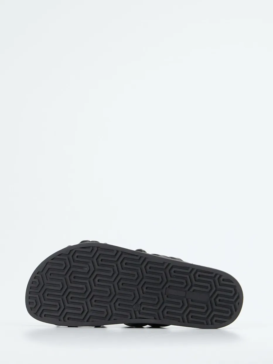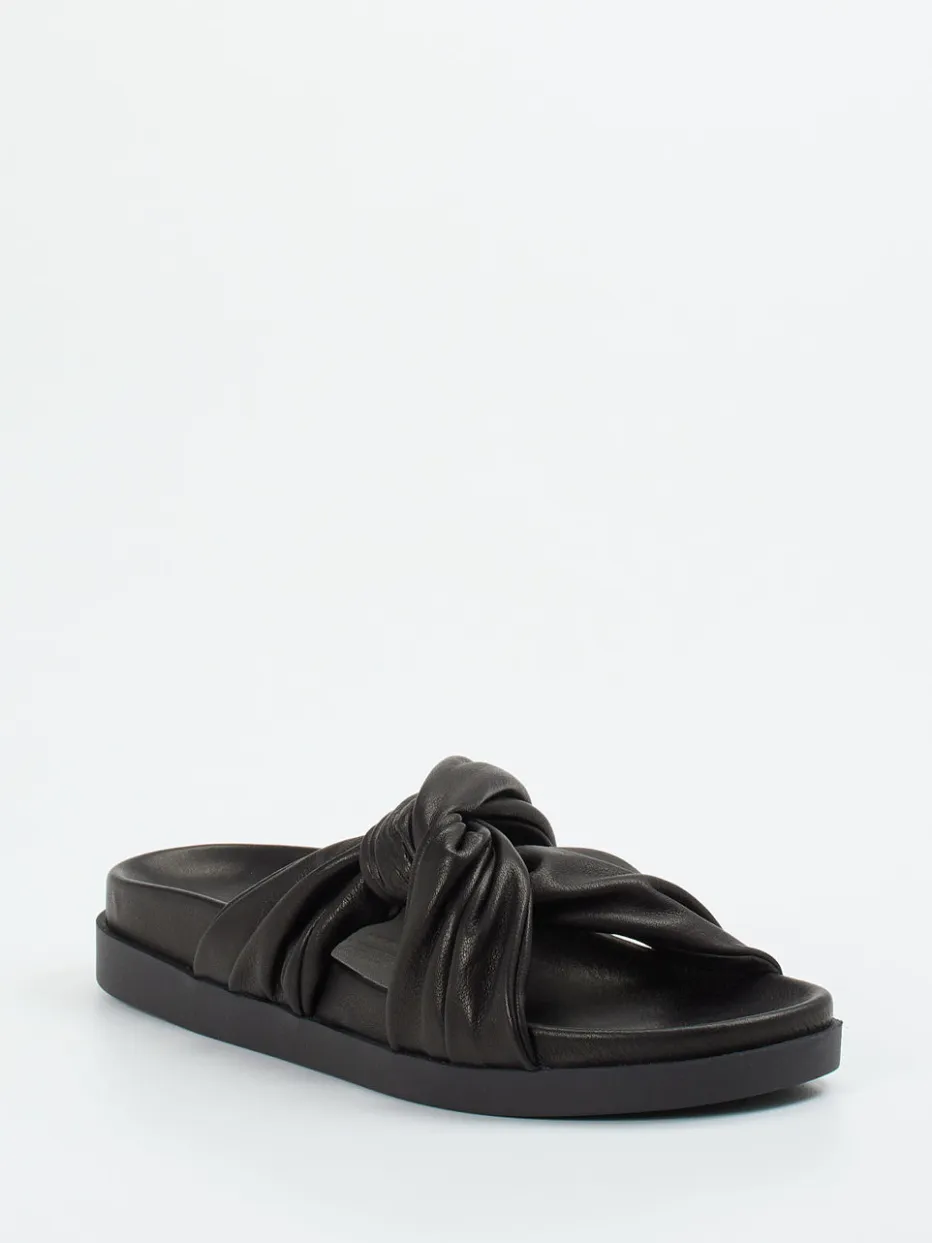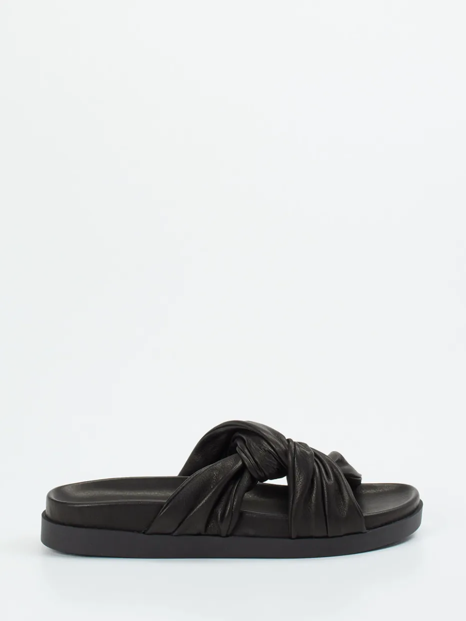 Die gepolsterten Slides verbinden hochwertiges Kalbleder mit modischer Knotenoptik und stehen für soften Komfort im minimalistischen Stil.