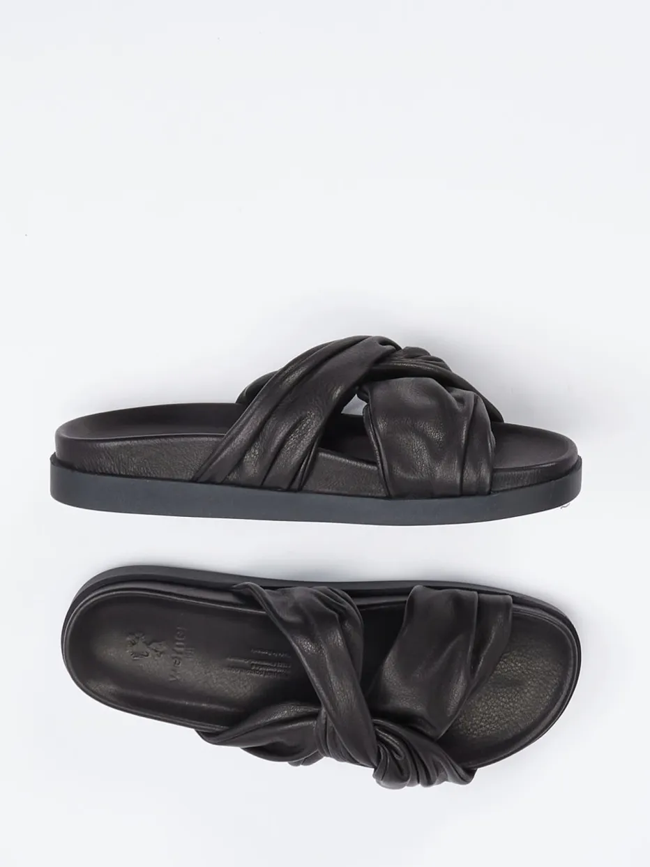 Eleganz trifft Entspannung.Die Marke Werner präsentiert stilvolle Slides für Damen, gefertigt aus feinem Kalbleder. Ideal für freie Tage und entspannte Spaziergänge im urbanen Umfeld: Das glänzend schwarze Kalbleder zeigt sich auf gepolsterten Riemen mit dekorativer Knotenoptik und betont den modernen „Quiet Luxury“-Trend. Die offene, flache Form mit breiter Bandage unterstützt einen bequemen Einstieg ohne Verschluss. Durch die rutschhemmende Profilsohle eignet sich das Modell auch für kurze Wege im Alltag. Die matte Oberfläche und die sanften Falten verleihen dem Schuh eine modisch-lässige Optik. Perfekte Ergänzung für Leinen-Ensembles und puristische Sommerlooks. Soft gepolstert, trendstark und komfortorientiert – mit Werner typisch stilvoll umgesetzt.