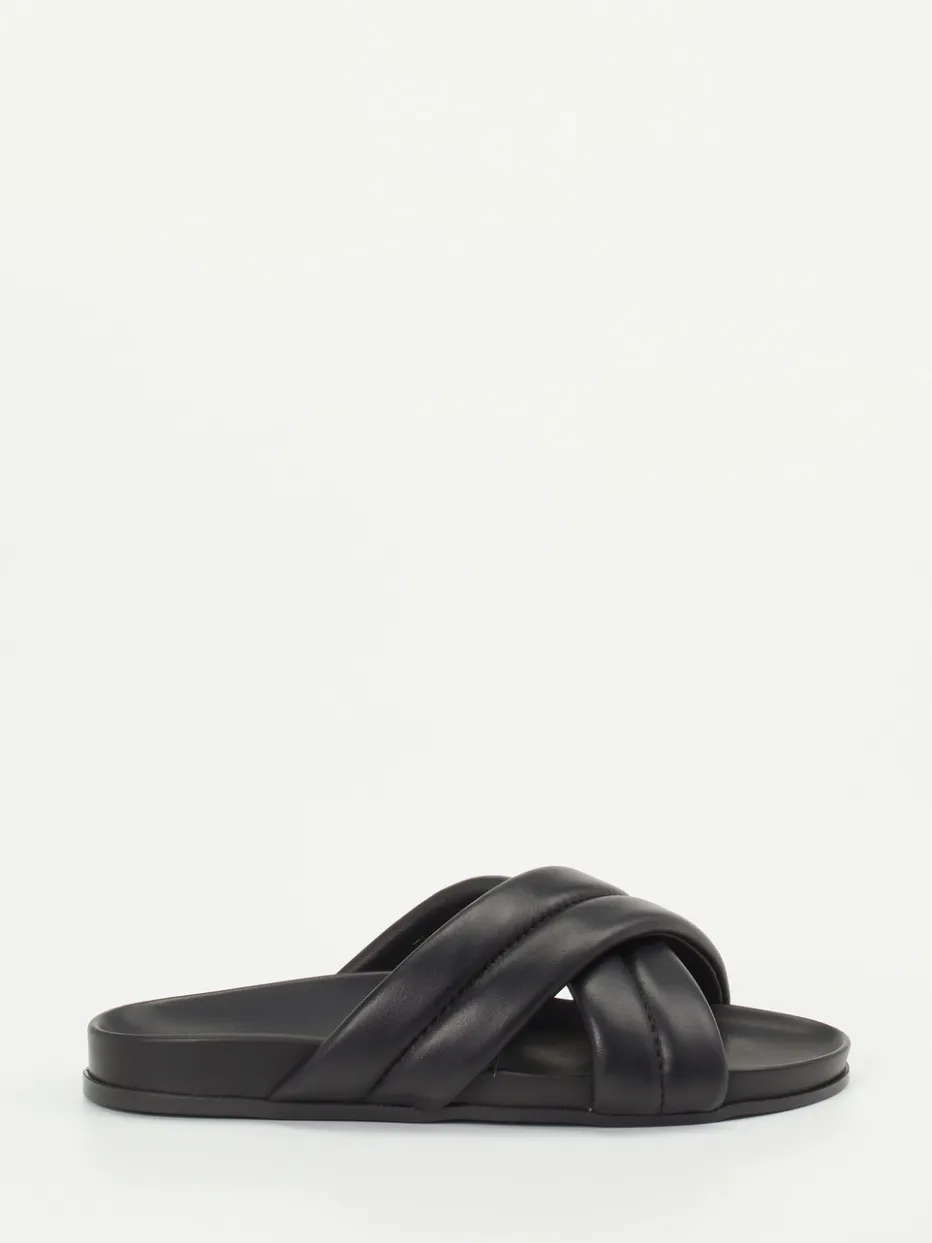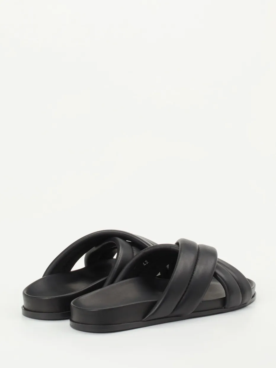 Schwarze Slides aus hochwertigem Kalbleder vereinen minimalistisches Design mit modernem Komfort. Gepolsterte Riemen und ergonomische Form sorgen für ein stilvolles Trageerlebnis.