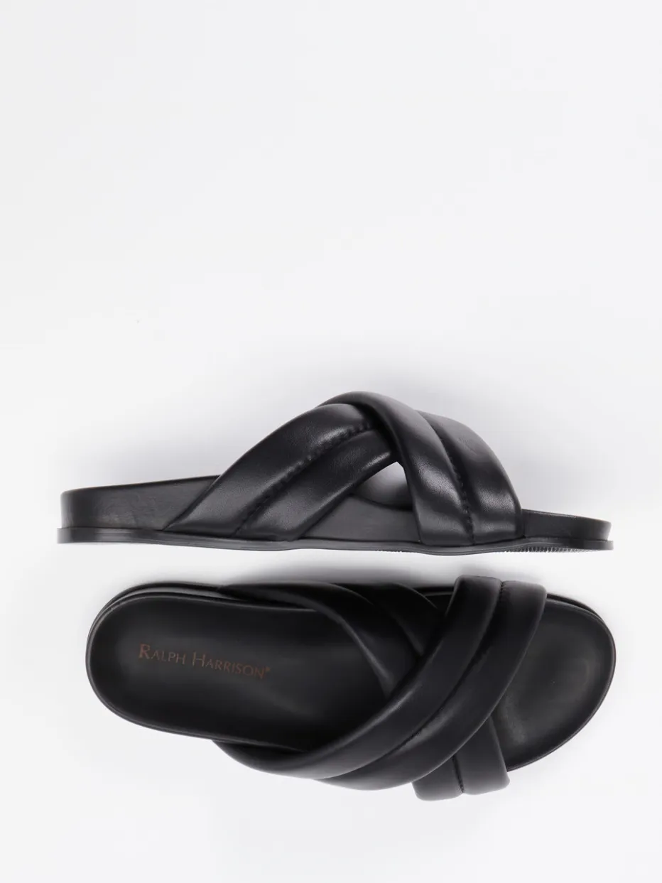 Schlichte Eleganz für warme Tage.Ralph Harrison präsentiert klassische Slides in hochwertiger Ausführung. Ideal für Urlaub und Freizeitmoment: Diese flachen Sandalen aus schwarzem Kalbleder überzeugen mit matt schimmernden, gekreuzten Riemen und gepolsterter Innensohle. Die ergonomische Silhouette und rutschhemmende Gummisohle bieten Komfort bei jedem Schritt. Ton-in-Ton-Nähte und ein schlanker Schnitt unterstreichen den Quiet-Luxury-Look. Der unisex Minimalismus harmoniert mit Leinenhose oder Oversize-Shirt. Ein Sommer-Essential mit zurückhaltendem Stilbewusstsein.