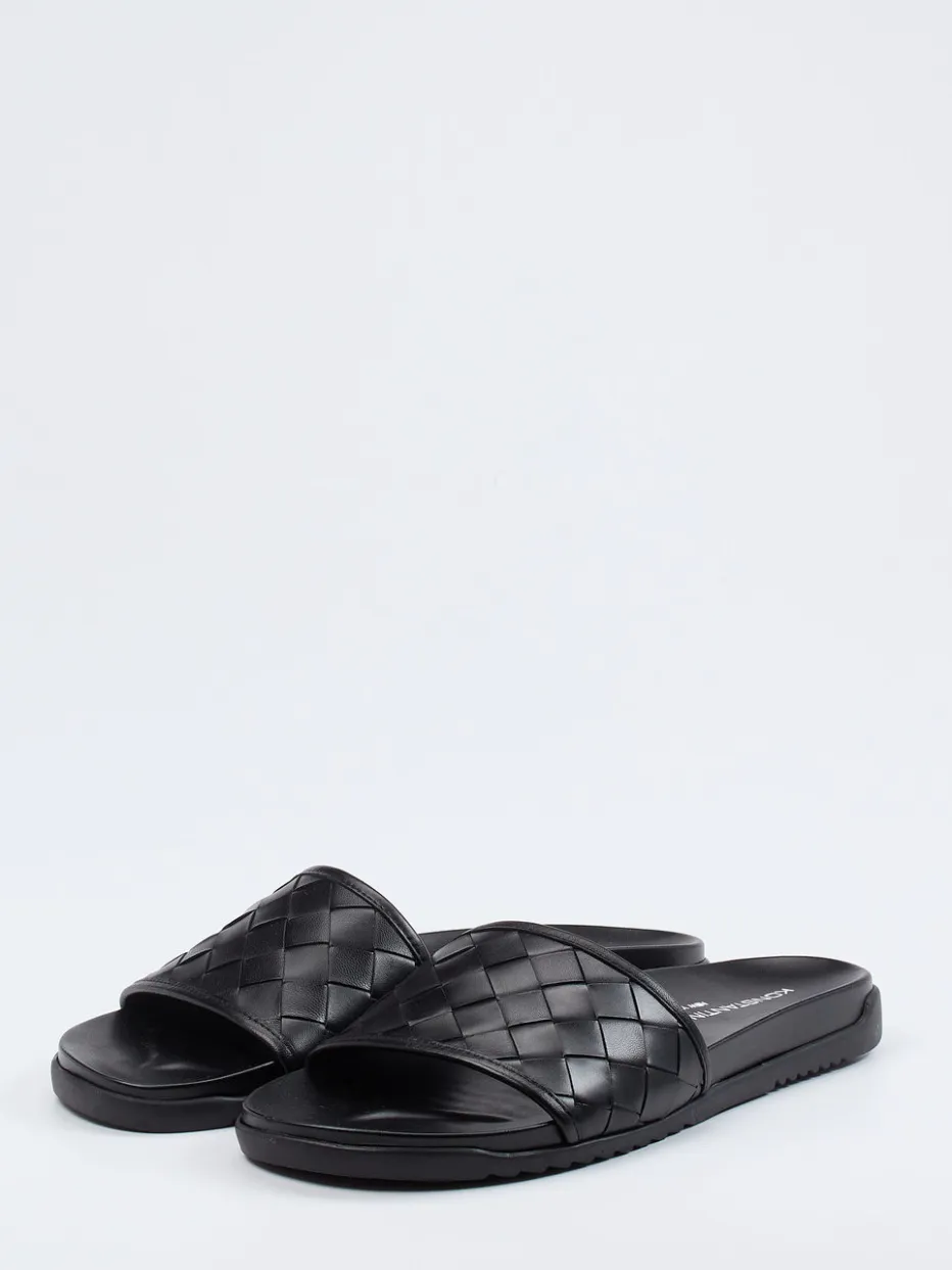 Ideal für entspanntes Flanieren oder den Alltag zu Hause – das schwarze Lammleder zeigt sich samtig verarbeitet in dezenter Flechtoptik. Die flache Silhouette ohne Verschluss unterstreicht den modernen Streetwear-Einfluss. Für Komfort sorgen die weich gepolsterte Innensohle und die strukturierte Gummilaufsohle. Der Ton-in-Ton-Look unterstützt die klare, reduzierte Ausstrahlung und ist ein stilistisches Statement zu „Quiet Luxury“. Perfekt kombinierbar mit Leinen-Shorts oder monochromen Casual-Looks.