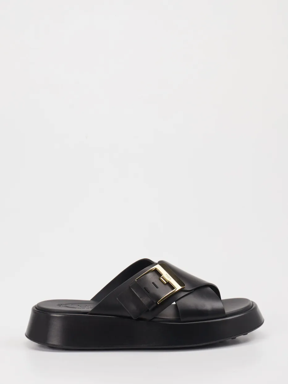 Stilsicher durch den Sommer. Tod’s präsentiert mit dieser Damen-Pantolette ein stilbewusstes Slide-Modell, das Funktionalität und Design vereint. Ideal für warme Tage in der Stadt oder entspannte Urlaubsmomente: Das Modell aus feinem, mattem Lammleder in klassischem Schwarz setzt auf klare Linien und hochwertigen Minimalismus. Überkreuzte Riemen und eine auffällige, goldfarbene Schnalle sorgen für visuelles Interesse, während das weiche Kalblederfutter und die gepolsterte Innensohle hohen Tragekomfort garantieren. Die gummierte Plateau-Sohle verleiht Stabilität und liegt im Trend „Chunky Slides SS25“. Vielseitig kombinierbar mit Leinenhose oder Seidenkleid. Ein hochwertiges Styling-Essential mit der Handschrift italienischer Handwerkskunst.