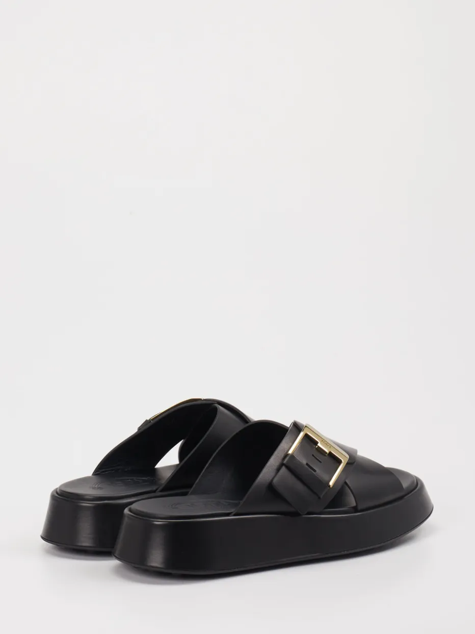 Die minimalistischen Slides von Tod’s kombinieren luxuriöses Lammleder und goldfarbene Details mit hohem Tragekomfort – perfekt für urbane Sommermomente.