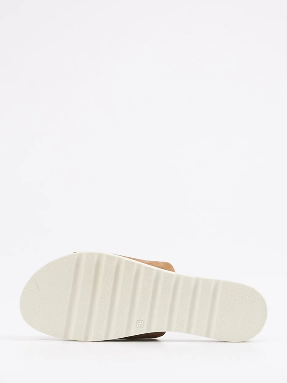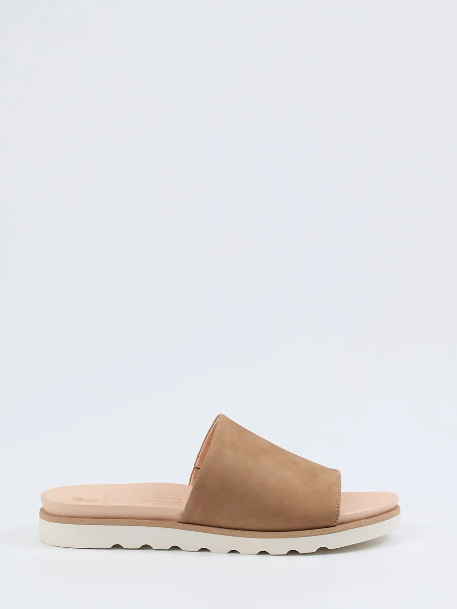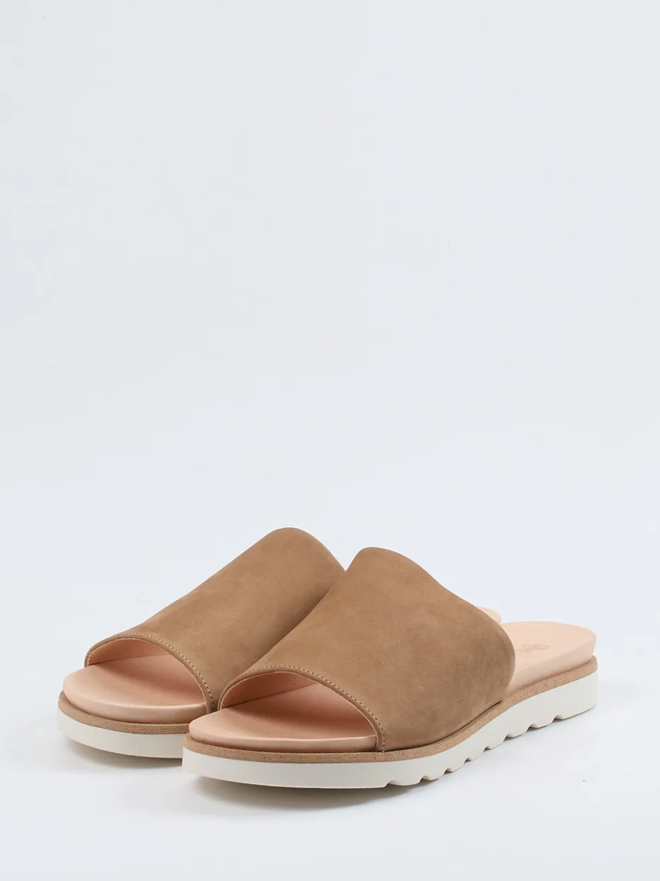 Ob bei einem Stadtbummel oder am Urlaubsort – das breite, samtige Nubukleder in Mittelbraun wirkt elegant-reduziert und angenehm weich zur Haut. Der offene, flache Schnitt betont die luftige Silhouette, während das gepolsterte Lederfußbett gemeinsam mit der rutschfesten, weiß betonten Gummisohle für Komfort und Trittsicherheit sorgt. Die natürliche Farbwelt und das cleane Design folgen dem „Quiet Luxury“-Trend der Saison. Ideal zu Leinenhosen oder entspannten Alltagslooks.