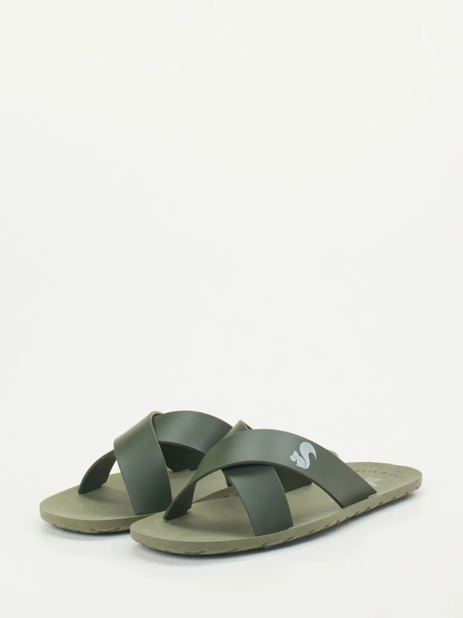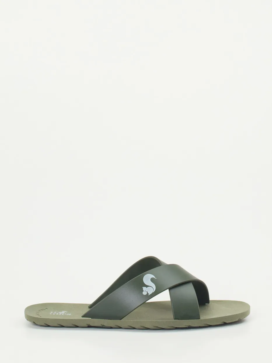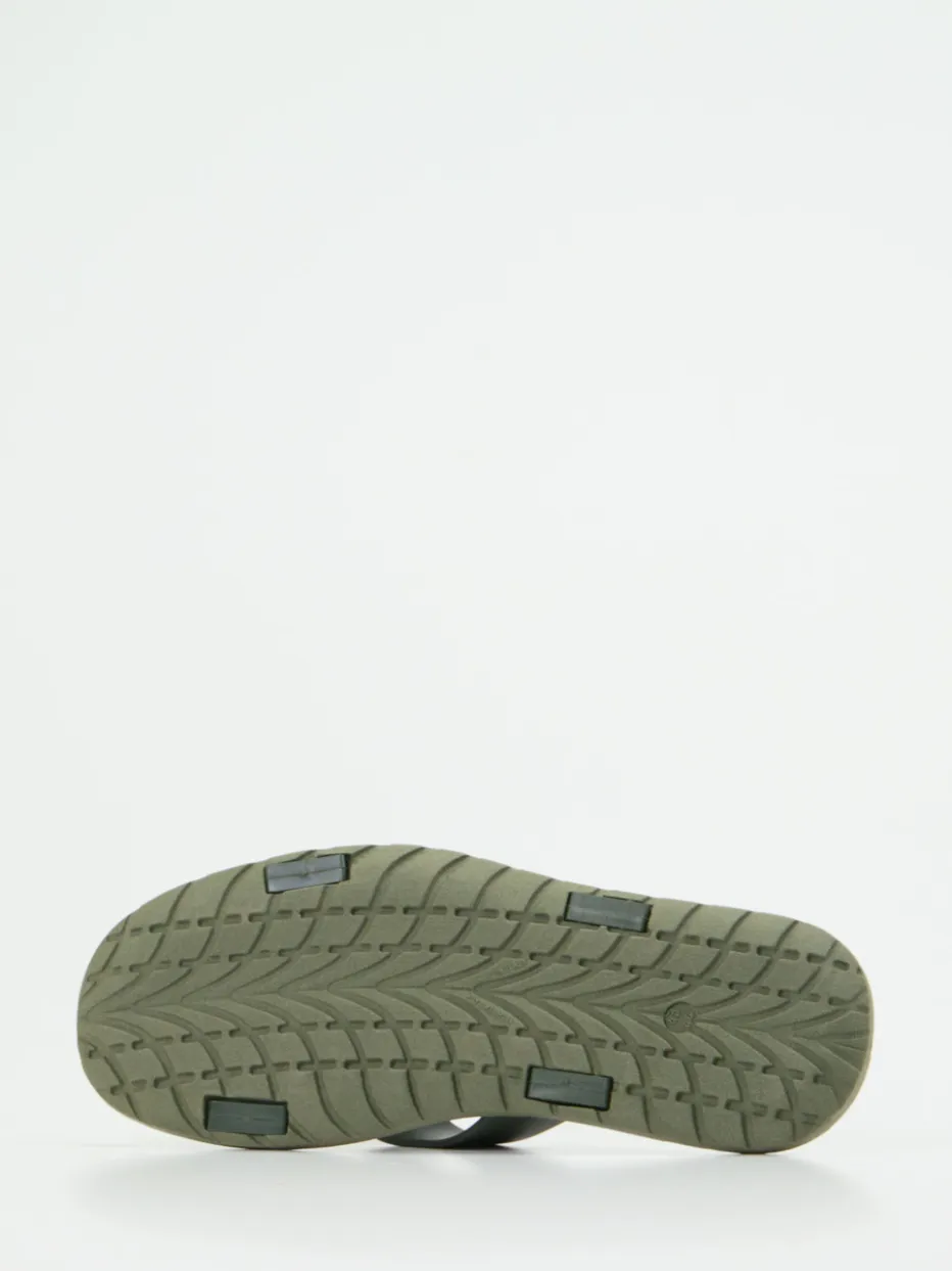 Dank der flachen, ergonomisch geformten Gummisohle und dem überkreuzten Riemen aus mattem, grünem Synthetikmaterial bietet dieses Modell eine gelungene Mischung aus Komfort und Stil. Der weiß gedruckte Logo-Schriftzug setzt auf dem Kreuzriemen einen dezenten Markenakzent. Wasserresistenz und rutschhemmende Profilierung machen die Slides zu einem verlässlichen Sommerbegleiter – ob am Pool, in der City oder am Meer. Besonders trendaffin durch die Verbindung aus Quiet Luxury und Utility-Footwear.