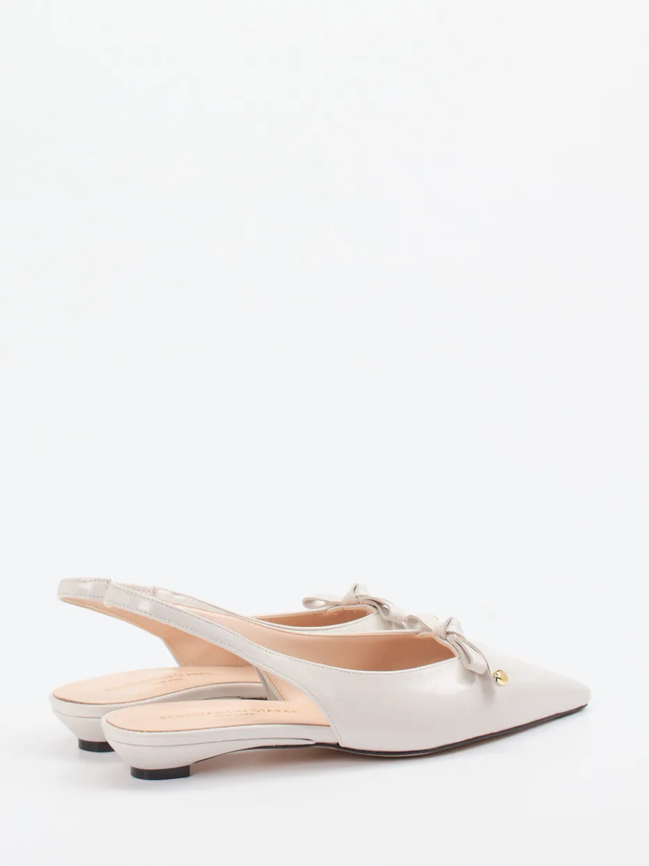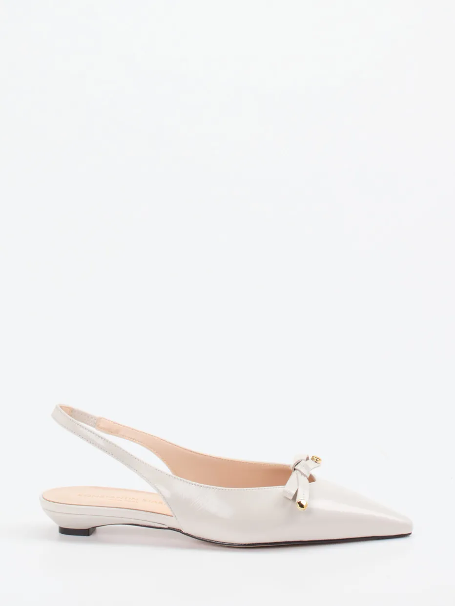 Minimalismus mit Raffinesse.Die Marke Konstantin Starke präsentiert elegante Slingback-Ballerinas für Damen. Ideal für Büro, Brunch oder besondere Anlässe: Das glanzveredelte Lammleder in zartem Beige wirkt besonders edel zur spitz zulaufenden Silhouette. Eine filigrane Zierschleife mit goldfarbenen Metallenden und ein elastischer Fersenriemen bieten feine Akzente und komfortablen Halt. Die Kombination aus Leder- und Gummisohle unterstreicht den hohen Qualitätsanspruch, während die klare Linie und der niedrige Absatz den Trend „Quiet Luxury“ modern interpretieren. Kombinierbar mit Seidenbluse oder lässigem Blazer. Ein stilvolles Statement für anspruchsvolle Looks mit diskretem Charme.