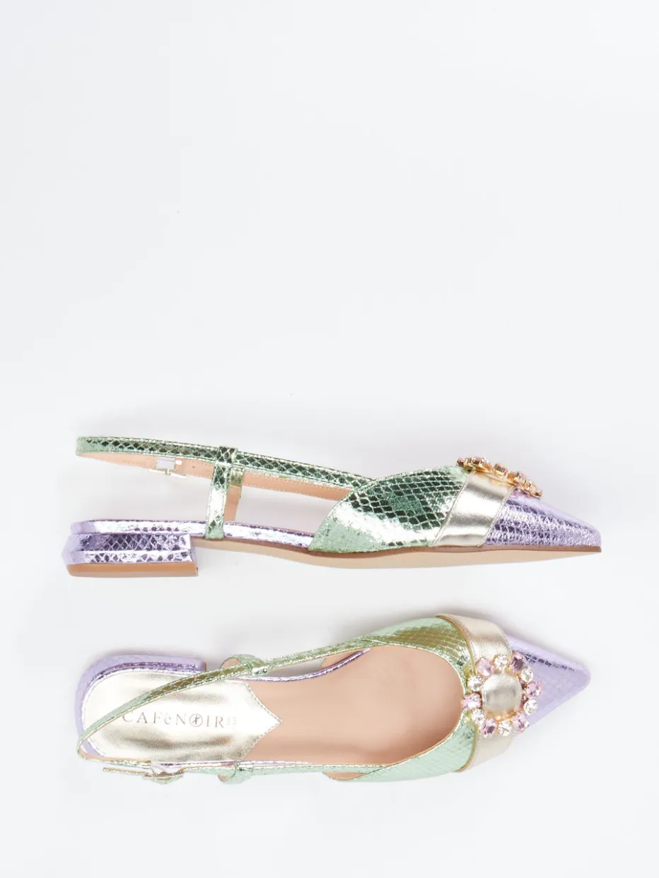 Extravaganz für besondere Stunden.CAFèNOIR präsentiert modische Slingback-Ballerinas für Damen mit effektvoller Farbgebung in Flieder, Mint und Gold. Ideal für festliche Events oder stilbewusste Abende: Das Metallicleder mit schimmernder Schlangenprägung vereint Farbenfreude mit einer glamourösen Oberfläche. Die spitze Form, ein verstellbarer Fersenriemen mit goldfarbener Schließe und eine dekorative Strassapplikation auf dem Vorderblatt runden das expressive Design ab. Dank leicht gepolsterter Lederinnensohle und 2 cm Absatzhöhe überzeugen diese Ballerinas auch funktional. Outfits im Y2K-Stil oder minimalistische Ensembles profitieren vom auffälligen Akzent dieser Schuhe. CAFèNOIR steht hier für femininen Stil mit luxuriöser Ausstrahlung.