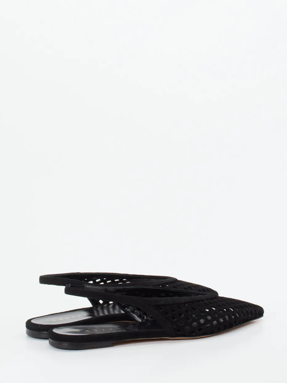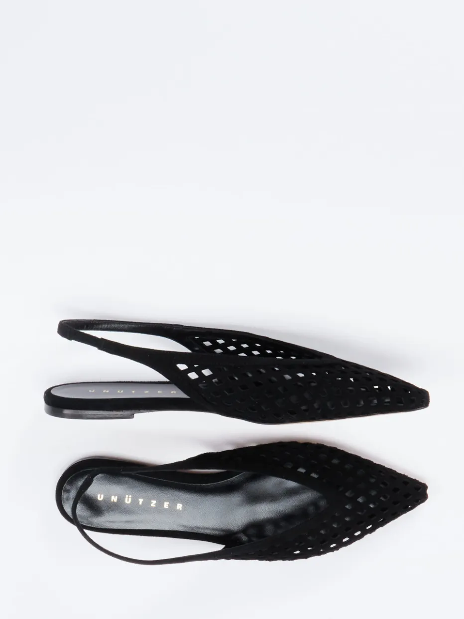 Stilvolle Leichtigkeit für warme Tage.Die Marke Unützer präsentiert diese eleganten Slingback-Ballerinas für Damen. Ob im Büro oder beim Stadtbummel: Das schwarze Veloursleder mit samtig-matter Oberfläche und perforierter Mesh-Optik bietet stilvolle Atmungsaktivität. Die spitz zulaufende Silhouette betont eine feminine Linienführung, während der flache Absatz und das weich gepolsterte Lederfußbett den Komfort sichern. Der Slip-on-Verschluss mit Slingback-Riemen verleiht sommerliche Leichtigkeit. Dezente Details und ein Design im Zeichen von „Quiet Luxury“ unterstreichen den puristischen Trendcharakter. Ein eleganter Schuh, der für handwerkliche Qualität und stilvolle Zurückhaltung steht.