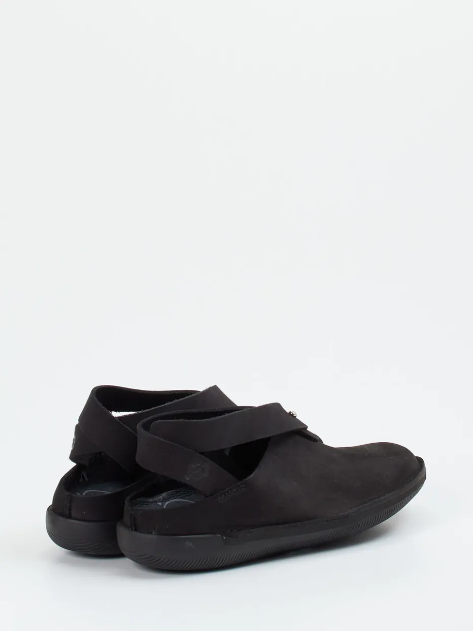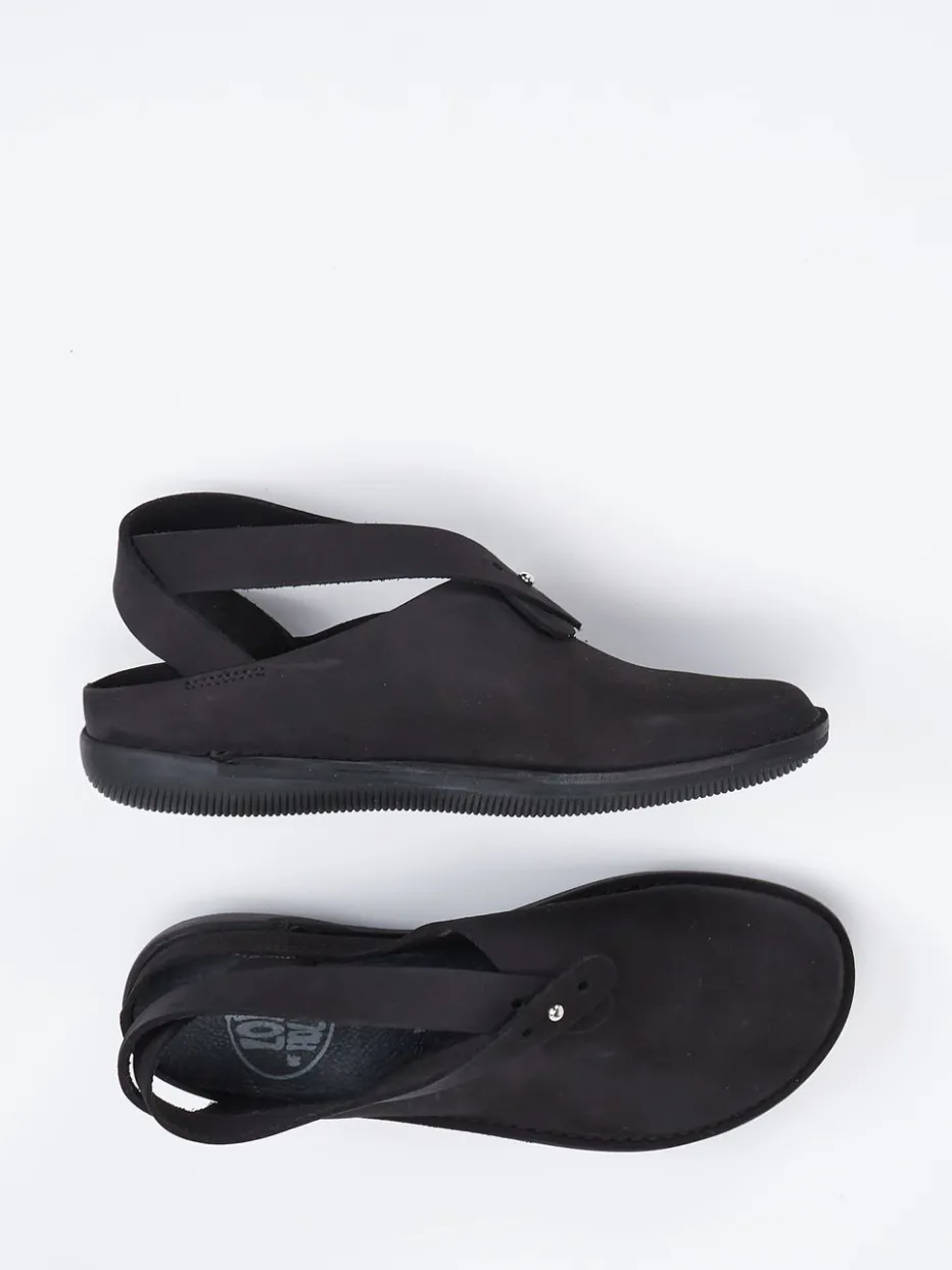 Die unisex Slingback-Clogs sind aus tiefschwarzem Nubukleder gefertigt – samtig angeschliffen und mit mattem Finish. Die geschlossene Silhouette vorne trifft auf eine offene Ferse mit verstellbarem Riemen, der durch einen silberfarbenen Druckknopf akzentuiert wird. Die profilierte Gummisohle sorgt für Trittsicherheit im urbanen Umfeld. Geprägt vom Trend „Quiet Luxury“ überzeugt das Modell mit klarer Formensprache und ergonomischer Passform. Kombiniert mit Baumwollsocken entsteht ein stilvoller Look für zu Hause und Stadtspaziergänge.
