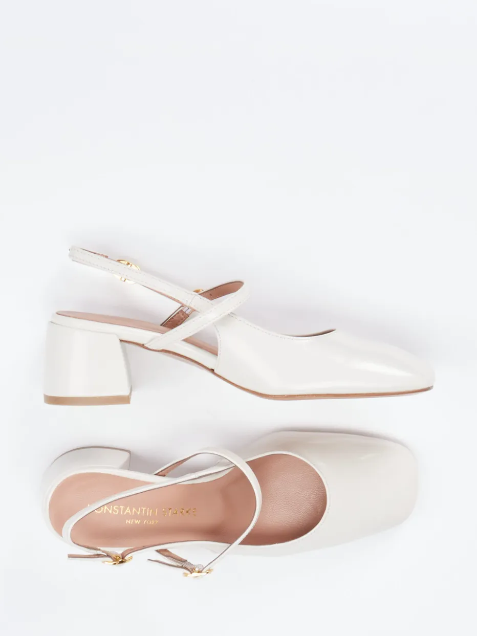 Retro-Eleganz neu interpretiert.Konstantin Starke präsentiert mit diesen Pumps ein charmantes Damenmodell in Slingback-Mary-Jane-Ausführung. Ideal für sommerliche Empfänge, Büro-Tage oder elegante Dinner: Das elfenbeinfarbene Lackleder besitzt eine edel glänzende Oberfläche und liegt auf einer modernen Carré-Leiste. Die filigranen Riemchen mit goldfarbenen Schnallen erlauben eine individuelle Passform und setzen stilvolle Akzente. Der Blockabsatz in angenehmer Höhe sorgt für Tragekomfort und unterstreicht das harmonische Design. Inspiriert von 90s-Vintage-Looks und aktueller Quiet-Luxury-Ästhetik, trifft Femininität auf Minimalismus. Kombiniert mit Midikleid oder Hosenanzug entsteht ein souveräner Auftritt. Ein Design, das Komfort und Stil von Konstantin Starke vereint.