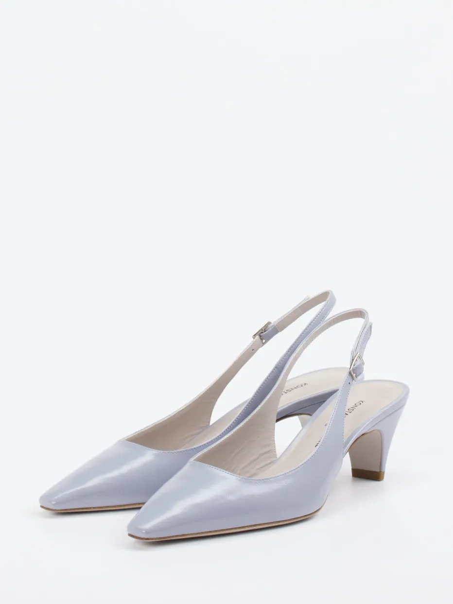 Fein schimmerndes Lackleder und eine spitz zulaufende Silhouette machen diesen Slingback zu einem stilvollen Element moderner Eleganz. Perfekt abgestimmt auf den Pastelltrend der Saison.