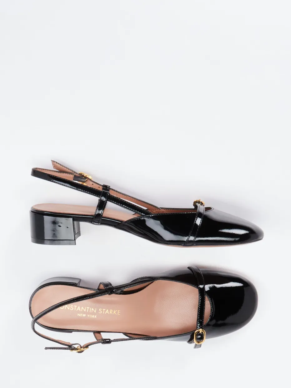 Der glänzende Look dieser Slingpumps spiegelt zeitlose Eleganz und Retro-Charme wider. Lackleder und goldfarbene Schnallen vereinen hochwertige Verarbeitung mit femininer Linienführung.