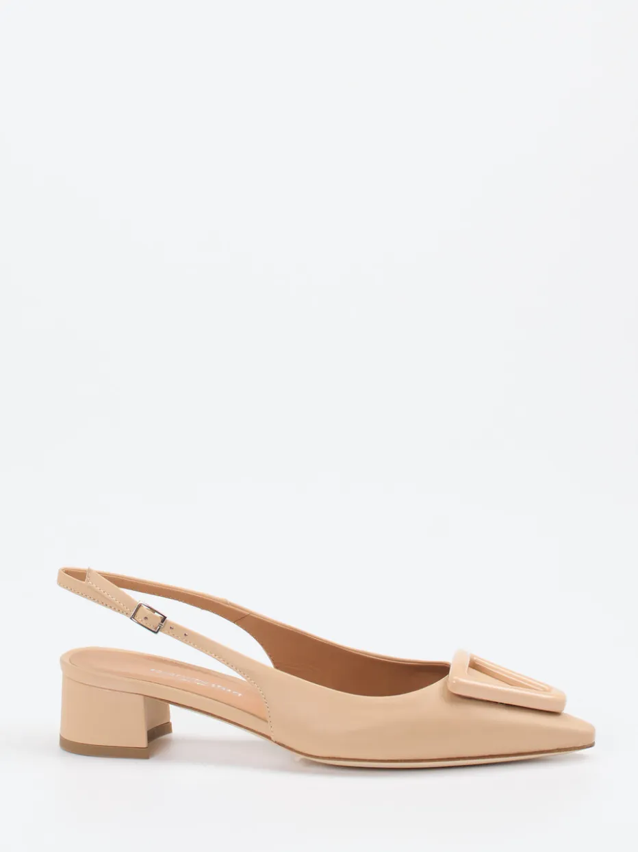 Mit glänzendem Lammleder im Nude-Ton und spitzer Silhouette verbinden diese Slingback-Pumps subtile Eleganz mit stilprägendem Minimalismus.
