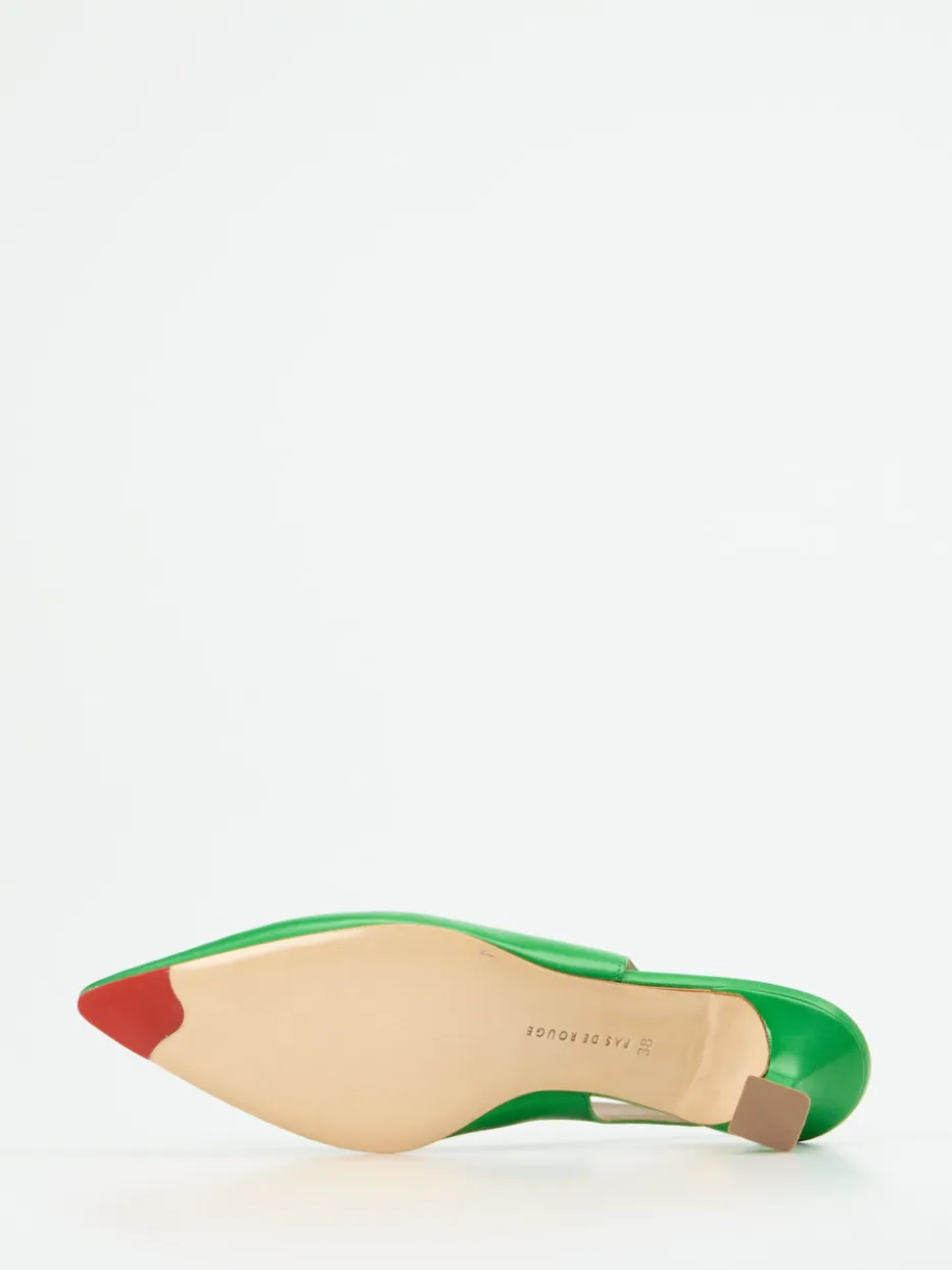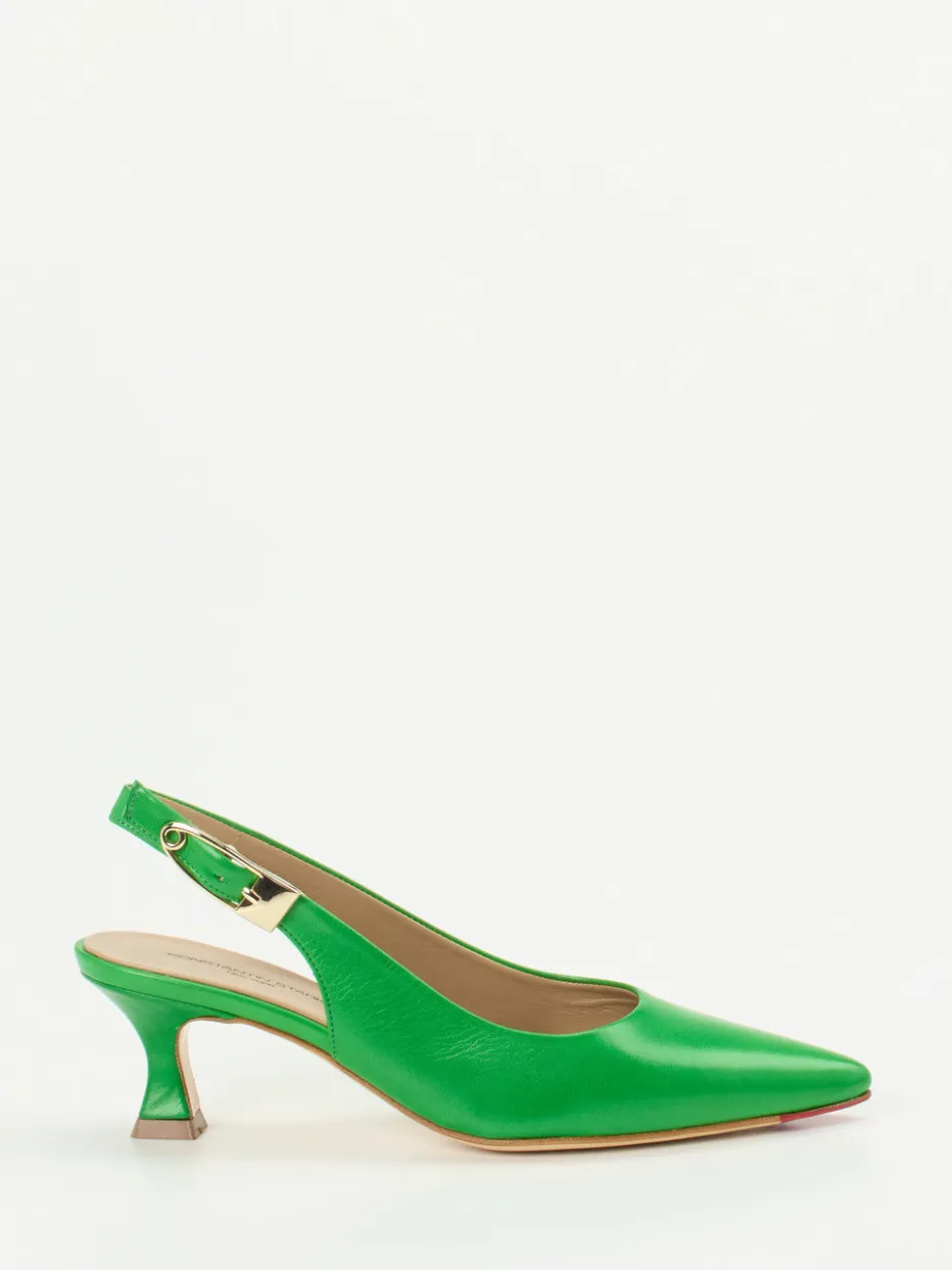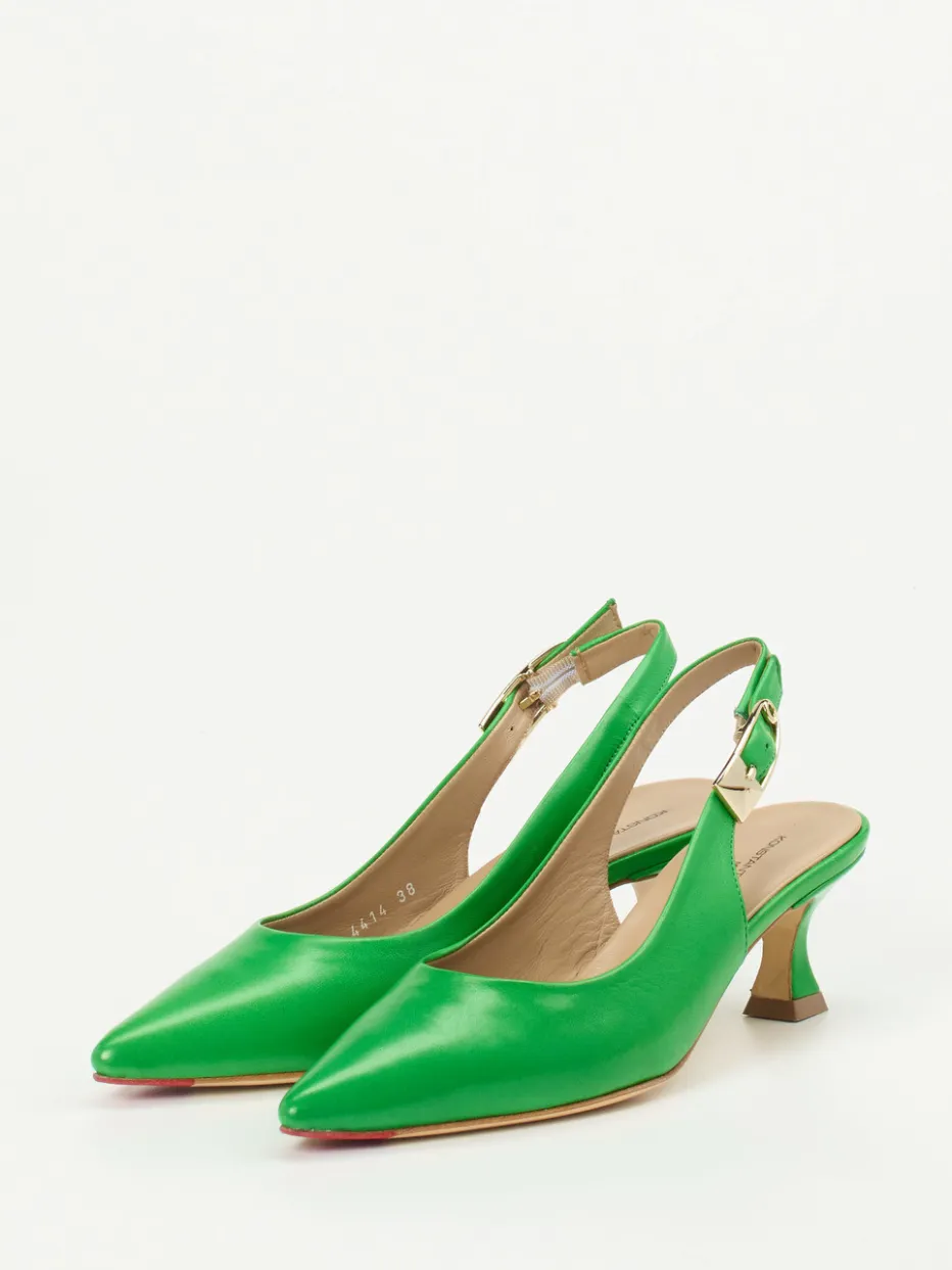 Gefertigt aus hochwertigem Lammleder mit glänzender Oberfläche zeigt sich das Modell in ausdrucksvollem Grasgrün. Die spitz zulaufende Form, der komfortable Kitten Heel mit leicht ausgestellter Absatzform und eine markante goldfarbene Schnalle sorgen für Eleganz und Retro-Flair. Die asymmetrische Linienführung unterstreicht den modernen Vintage-Touch. Innen verwöhnt weiches Lammnappa, die Ledersohle bietet angenehmen Tragekomfort. Perfekt zu A-Linien-Kleidern und minimalistischen Accessoires.