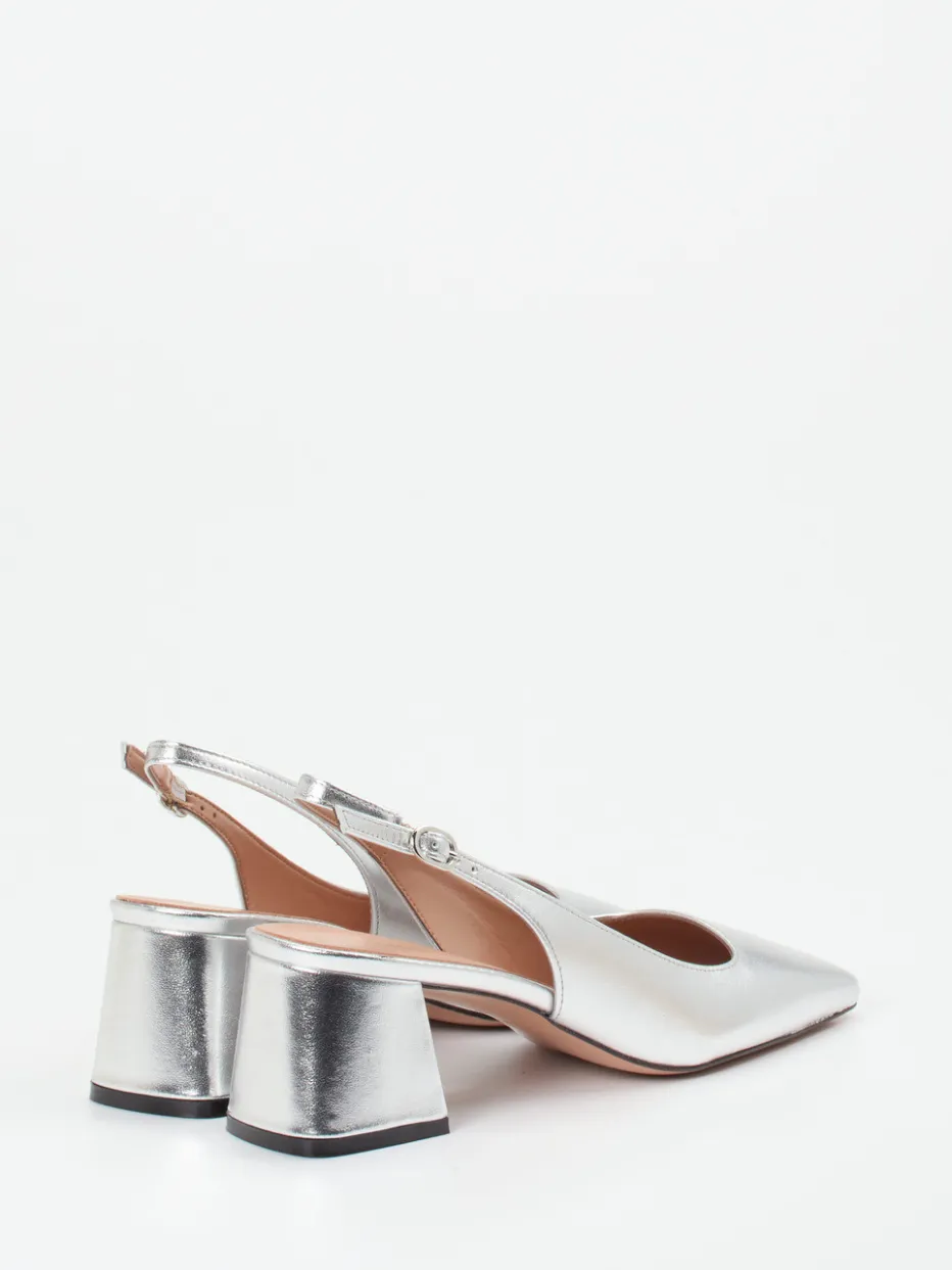 Elegante Slingpumps mit glänzendem Silber-Finish und komfortablem Blockabsatz – ideal für moderne Retro-Looks mit Stilbewusstsein.