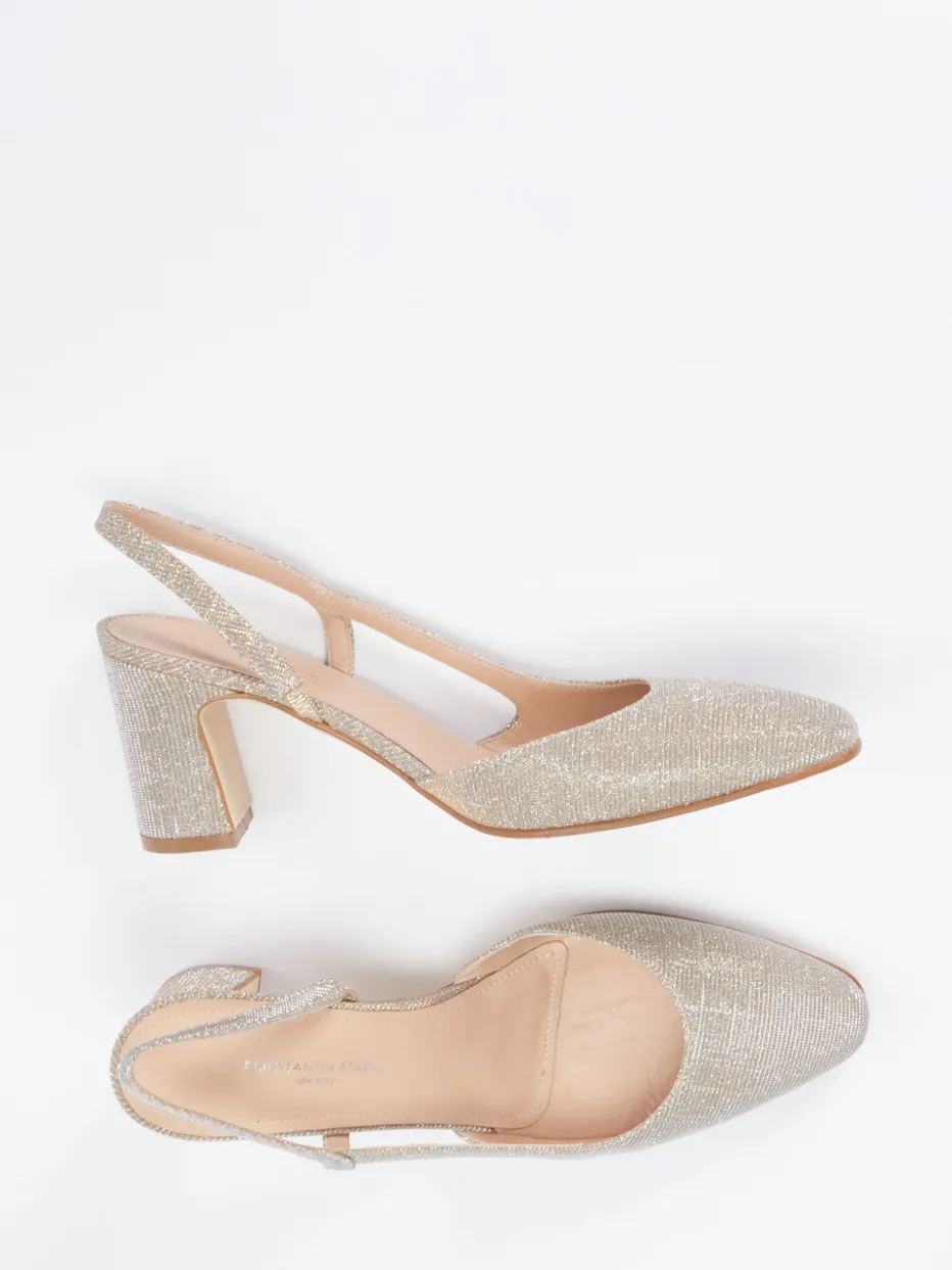 Glamouröse Momente, stilsicher inszeniert.Konstantin Starke präsentiert feminine Slingback-Pumps in eleganter Formgebung. Ob zur Hochzeit oder für exklusive Events – das champagnergoldene Metallicleder mit glänzender Glitzerstruktur unterstreicht den edlen Charakter dieser Pumps. Die spitz zulaufende Silhouette streckt optisch, das elastische Fersenriemchen sichert einen bequemen Sitz. Ein stabiler Blockabsatz von 6,5 cm verbindet stilvolles Design mit komfortabler Laufhöhe. Die Ledersohle und das Ziegenlederfutter runden die hochwertige Ausstattung ab. Im Trend mit „Quiet Luxury“ kombinierbar zu nudefarbenem Abendkleid oder minimalistischer Metallic-Clutch. Ein Schuh, der dezente Extravaganz und Tragekomfort vereint.