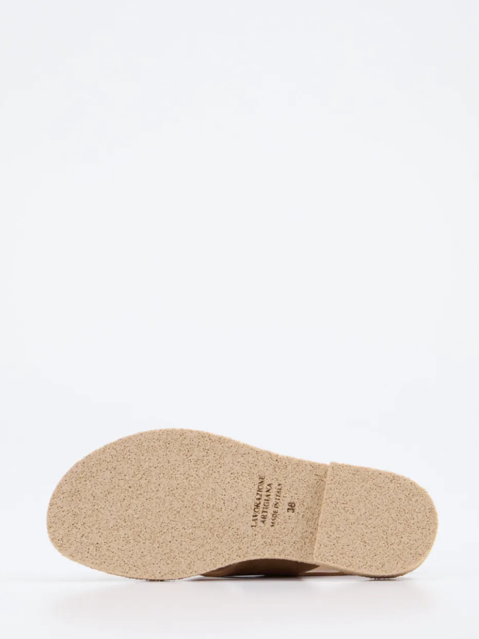 Ideal für entspannte Urlaubsmomente oder sommerliche City-Ausflüge überzeugt das Modell durch weiches Veloursleder in sandbeigem Farbton und eine glatte, matte Oberfläche. Die gekreuzten Riemen über dem Spann und der verstellbare Fersenriemen mit silberfarbener Dornschließe sorgen für sicheren Halt. Ergänzt wird das Design durch ein terrakottafarbenes Lederfutter und eine gepolsterte Innensohle. Der leichte Absatz und die Gummisohle mit Bimssteinstruktur unterstreichen Funktionalität und Stabilität. Trendig im „Quiet Luxury“-Kontext, harmoniert die Sandale ideal zu Leinen-Looks.