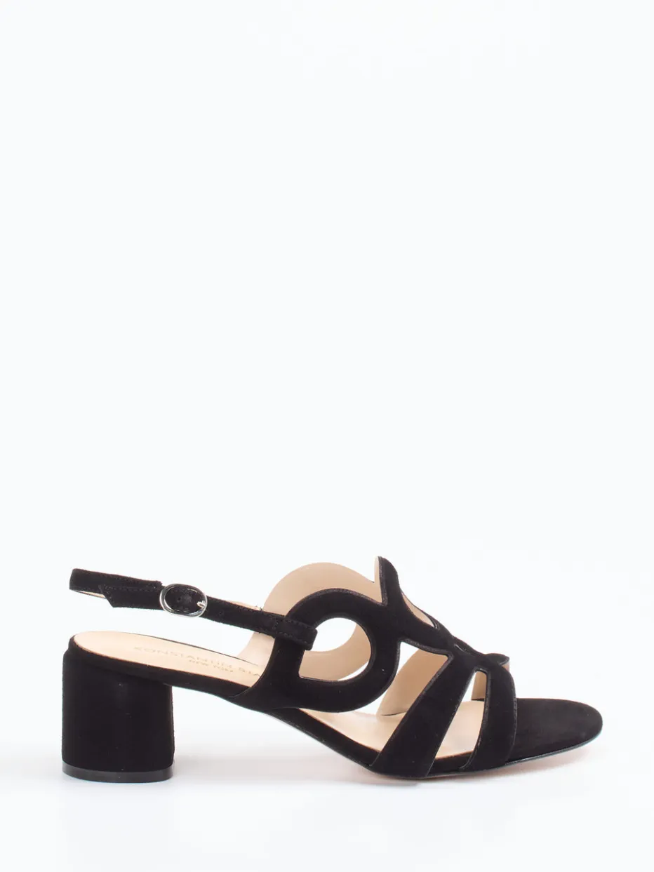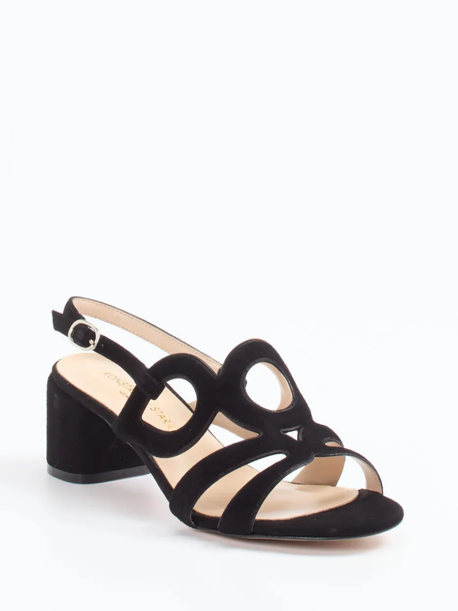 Cut-Out-Chic für anspruchsvolle Auftritte.Konstantin Starke präsentiert mit dieser Slingback-Sandale eine elegante Interpretation sommerlicher Formensprache. Ideal für festliche Anlässe ebenso wie den stilvollen Alltag, überzeugt das Modell mit schwarzem, samtig angeschliffenem Veloursleder. Die überkreuzte Riemenführung mit runden Cut-Outs unterstreicht die offene, geschwungene Silhouette. Ein verstellbarer Fersenriemen mit Metallschnalle sorgt für optimalen Halt, während das weiche Lammnappa-Futter und das gepolsterte Fußbett hohen Tragekomfort bieten. Der lederbezogene Blockabsatz lässt sich vielfältig kombinieren – etwa zu Midikleid oder Culotte. Minimalismus trifft Retro-Chic – zeitgemäß und hochwertig. Ein Modell für ruhigen Luxus und stilsichere Sommermomente.