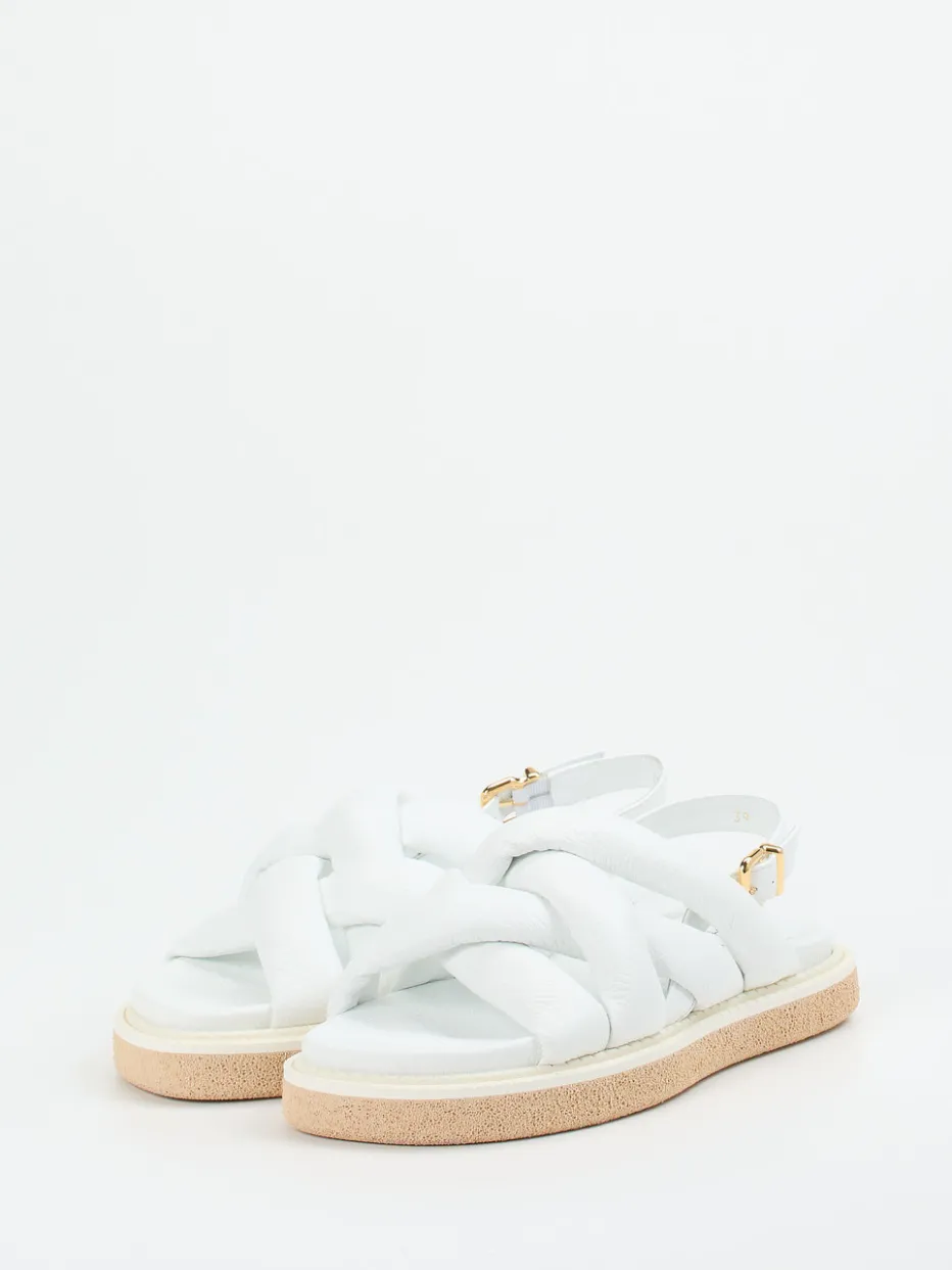 Understatement in Weiß.Truman’s präsentiert minimalistische Slingback-Sandalen für Damen. Die weiße Hirschledersandale mit genarbter Oberfläche bietet dank der gepolsterten Kreuzriemen und des weichen Lederfußbetts angenehmen Tragekomfort – ideal bei warmem Wetter oder auf Reisen. Ihre offene, flache Form, goldfarbene Metallschnalle und die helle Leichtzellsohle spiegeln den aktuellen „Quiet Luxury“-Trend wider. Die klare Linienführung betont den hochwertigen Look und passt besonders gut zum zeitlosen Sommerstil. Handwerkskunst aus Italien trifft auf dezente Eleganz – ein Komfort-Statement für anspruchsvolle Looks.