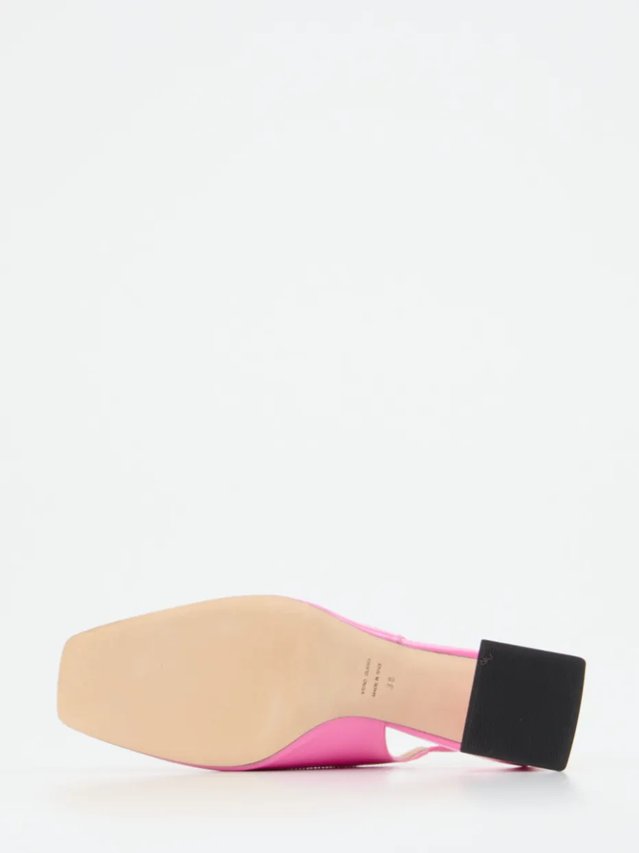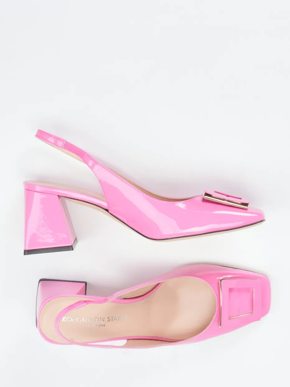 Glanzstück mit modischer Haltung.Konstantin Starke präsentiert feminine Slingpumps in leuchtendem Pink. Mit glänzendem Lackleder und klarer Carré-Form sprechen diese Schuhe für selbstbewusste Looks – ob bei sommerlichen Events oder abendlichen Anlässen. Die goldgerahmte, viereckige Schnalle auf dem Spann fungiert als edler Eyecatcher, der elastische Fersenriemen sorgt für komfortablen Sitz. Der 6,5 cm hohe, überzogene Blockabsatz unterstreicht die Retro-inspirierte Silhouette. Perfekt für stilbewusste Kombinationen mit Minirock, Metallic-Bag oder Statement-Socken. Designästhetik und Laufkomfort treffen auf trendorientierte Nonchalance.