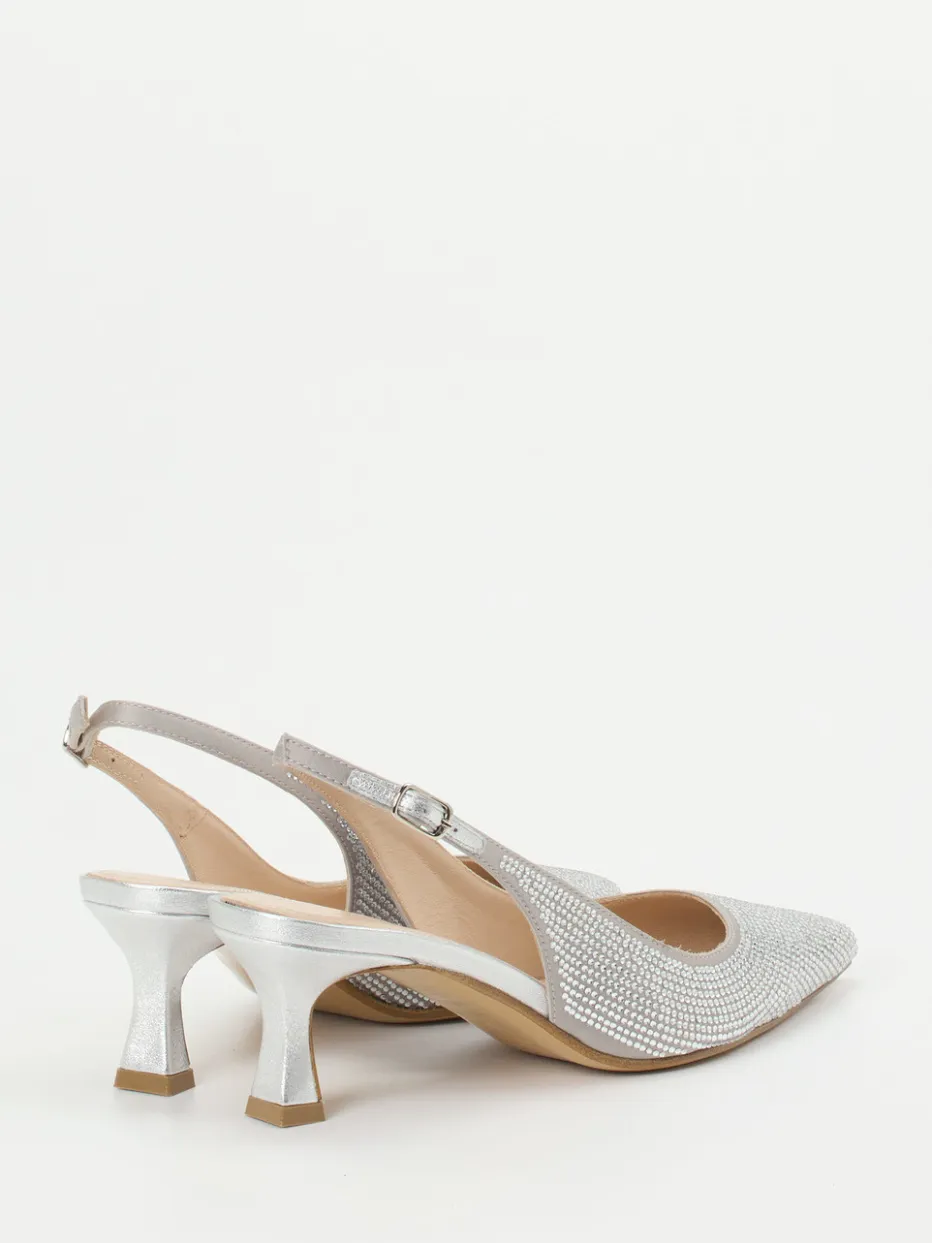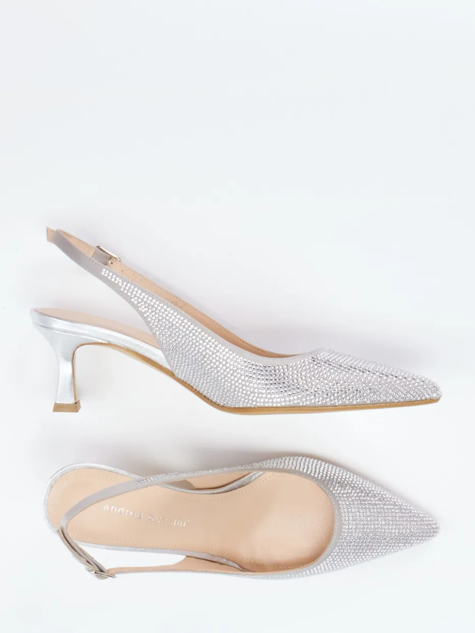 Perfekt inszeniert für besondere Anlässe.Die Marke Andrea Puccini präsentiert stilvolle Slingpumps für Damen, designt für Auftritte mit Wirkung. Ob festlicher Empfang oder glamouröses Dinner – das glänzende Metallicleder in Silber ist mit feinen Strasssteinen besetzt und bringt so ein luxuriöses Strahlen auf jeden Schritt. Der spitz zulaufende Leisten und der filigrane Kitten Heel formen eine elegante Silhouette im Vintage-inspirierten Y2K-Stil. Der verstellbare Fersenriemen mit Metallschnalle unterstreicht den femininen Look und sorgt für sicheren Halt. Besonders harmonisch wirken Metallic-Accessoires und Abendtaschen in Silberoptik. Ein stilvoller Begleiter für festliche Momente mit italienischer Handschrift.