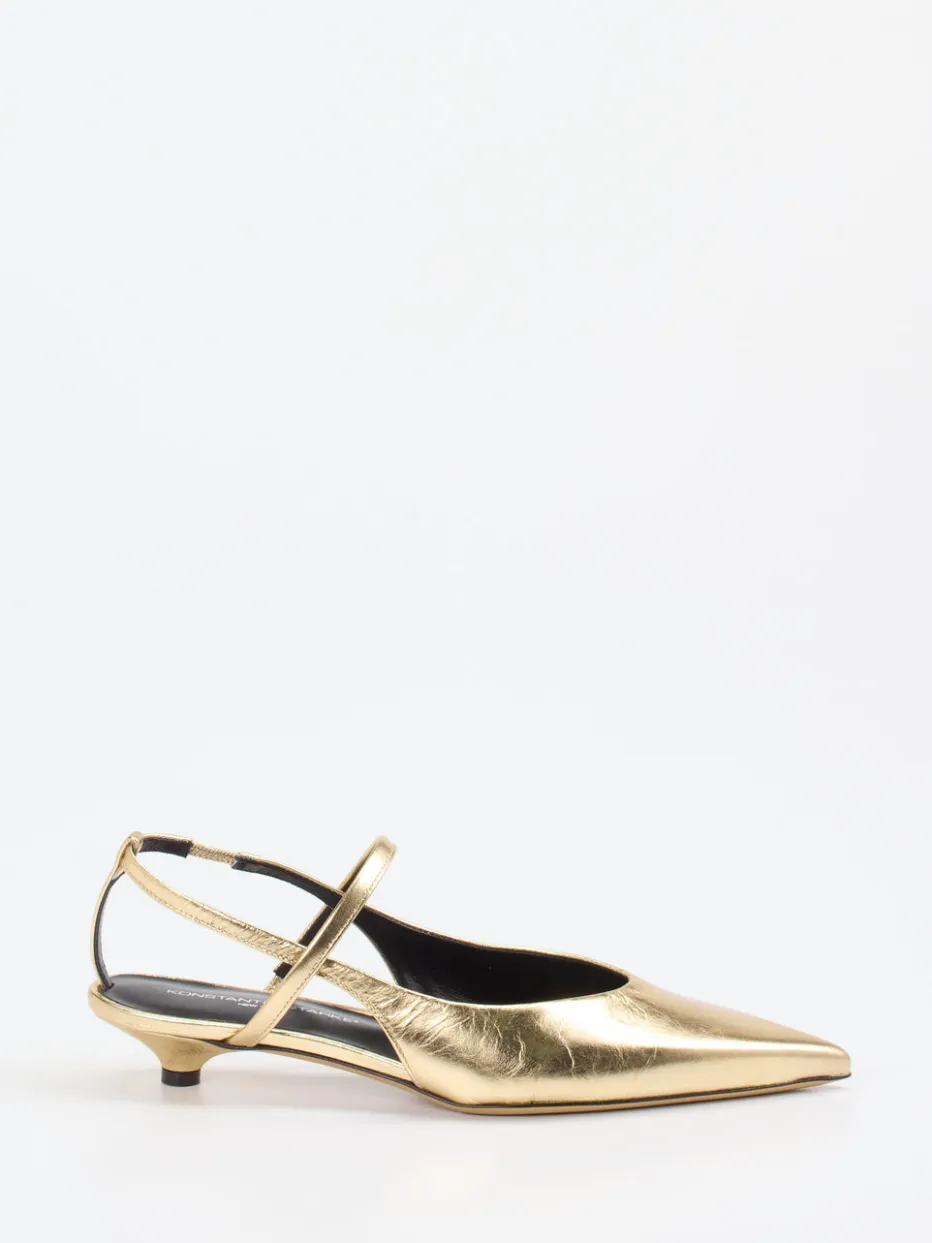 Glanz für besondere Momente.Die Marke Konstantin Starke bringt mit diesen Damen-Slingpumps ein Modell für festliche Events und stilvolle Abende auf den Punkt. Das hochwertige Metallicleder in Gold verleiht dem Schuh zusammen mit dem dezenten Faltenfinish eine luxuriös glänzende Optik. Die spitz zulaufende Form und der elegante Kitten Heel sorgen für eine anmutige Silhouette. Dank elastischem Fesselriemen und gepolstertem Lederfußbett bietet der Schuh angenehmen Komfort auch bei längerem Tragen. Die glatte Ledersohle steht für minimalistische Eleganz – perfekt im Rahmen aktueller Metallic- und Y2K-Trends. Ein stilvoller Favorit mit fein justierter Passform und raffiniertem Vintage-Appeal.
