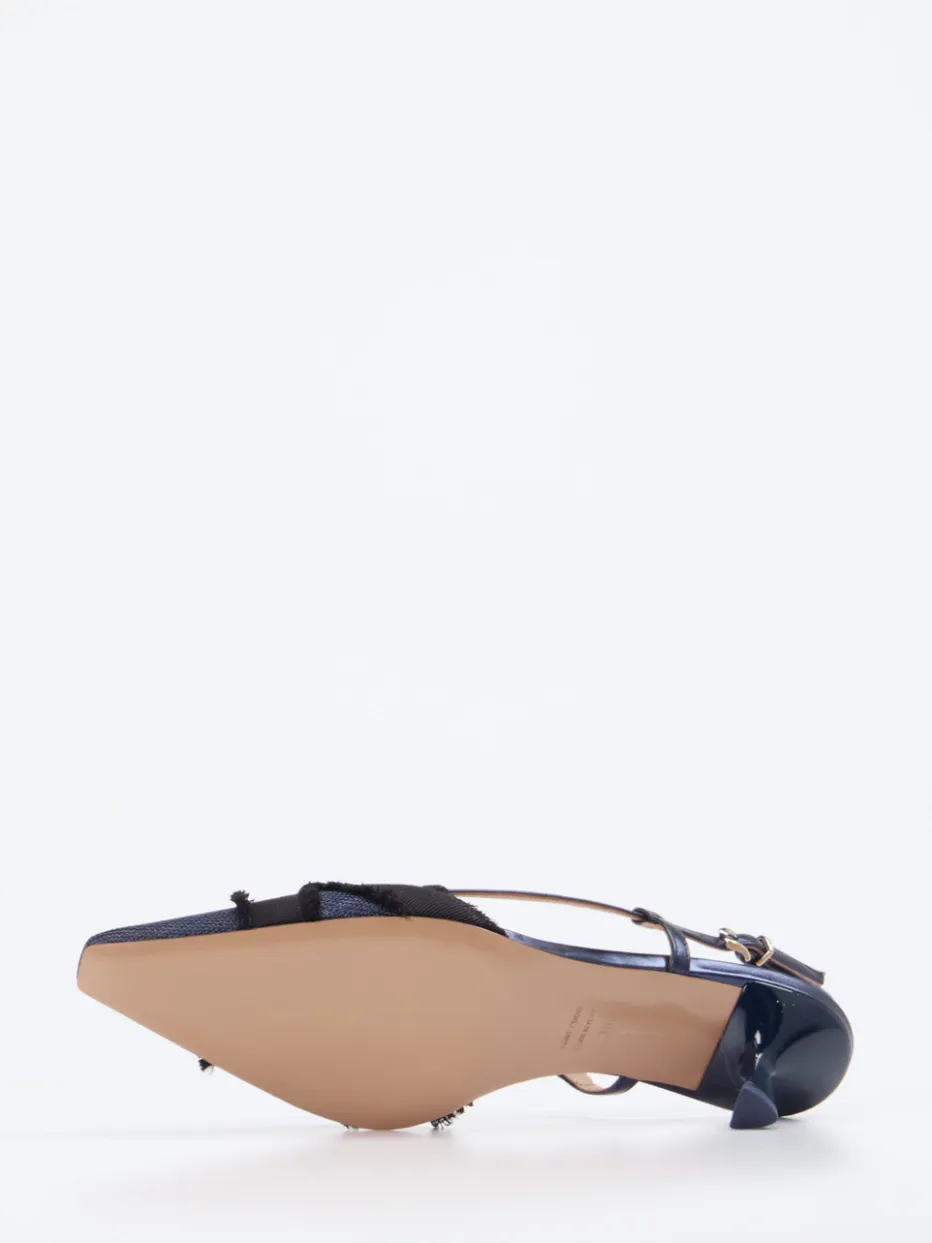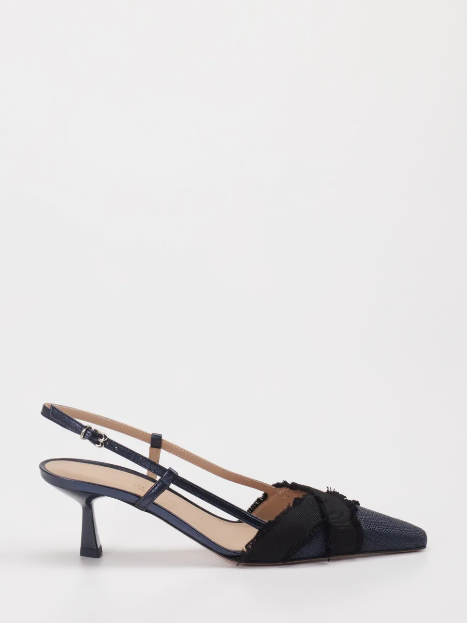 Ideal bei abendlichen Events oder festlichen Anlässen: Das strukturierte Textil in Dunkelblau, kombiniert mit glänzenden Riemen und fransigen Applikationen, verleiht dem Modell einen spannenden Texturmix. Die typisch spitze Form und der filigrane Slingback-Riemen mit Schnalle sorgen für eine elegante Silhouette. Funktional zeigt sich der stabile Kitten Heel mit angenehmer Höhe. Inspiriert von 90er-Jahre-Ästhetik und aktuellen Laufstegtrends, lässt sich der Pumps wunderbar zu Culotte oder Kleid sowie einer Clutch in Schwarz oder Blau kombinieren.