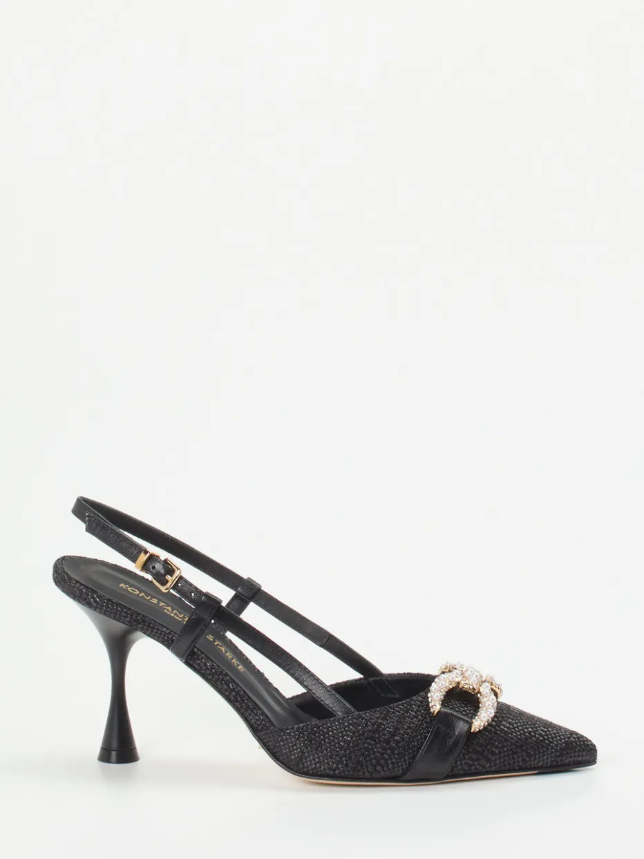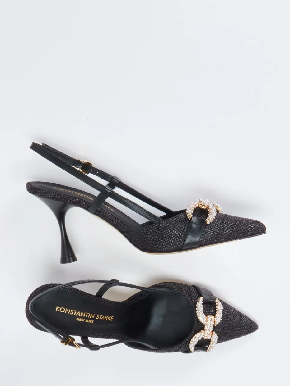 Eleganz trifft Strukturen.Konstantin Starke bringt mit diesen schwarzen Slingpumps einen modischen Stilklassiker in moderner Interpretation. Ein strukturierter Textilbezug verleiht dem Modell eine edle Haptik, ergänzt durch eine spitz zulaufende Silhouette. Publikumswirksam präsentiert sich die goldfarbene Strassschnalle als dekoratives Highlight. Der elegant ausgeformte Kitten-Heel und der verstellbare Fersenriemen sorgen für sicheren Halt und unterstreichen den Retro-Charme. Festliche Events, Galas oder Dinner-Looks erhalten durch diesen Statement-Schuh den letzten Schliff. Kombiniert mit einer Clutch in Metallic-Finish entsteht ein stilvoll abgestimmter Abend-Ensemble. Feine Materialien und Designverständnis vereinen sich zu anspruchsvoller Schuhmode mit markentypischer Präsenz.