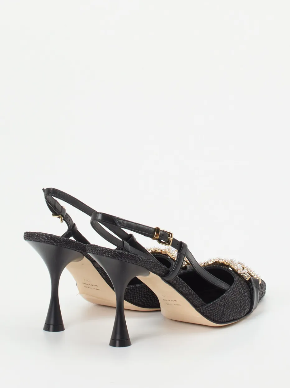 Die spitz zulaufenden Slingpumps verbinden glamouröse Details mit einer ikonischen Absatzform – ideal für extravagante Abendauftritte.