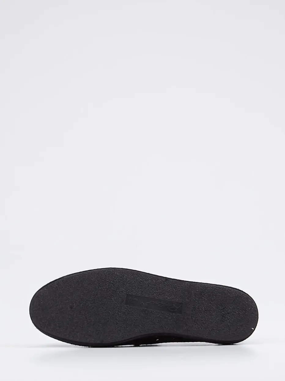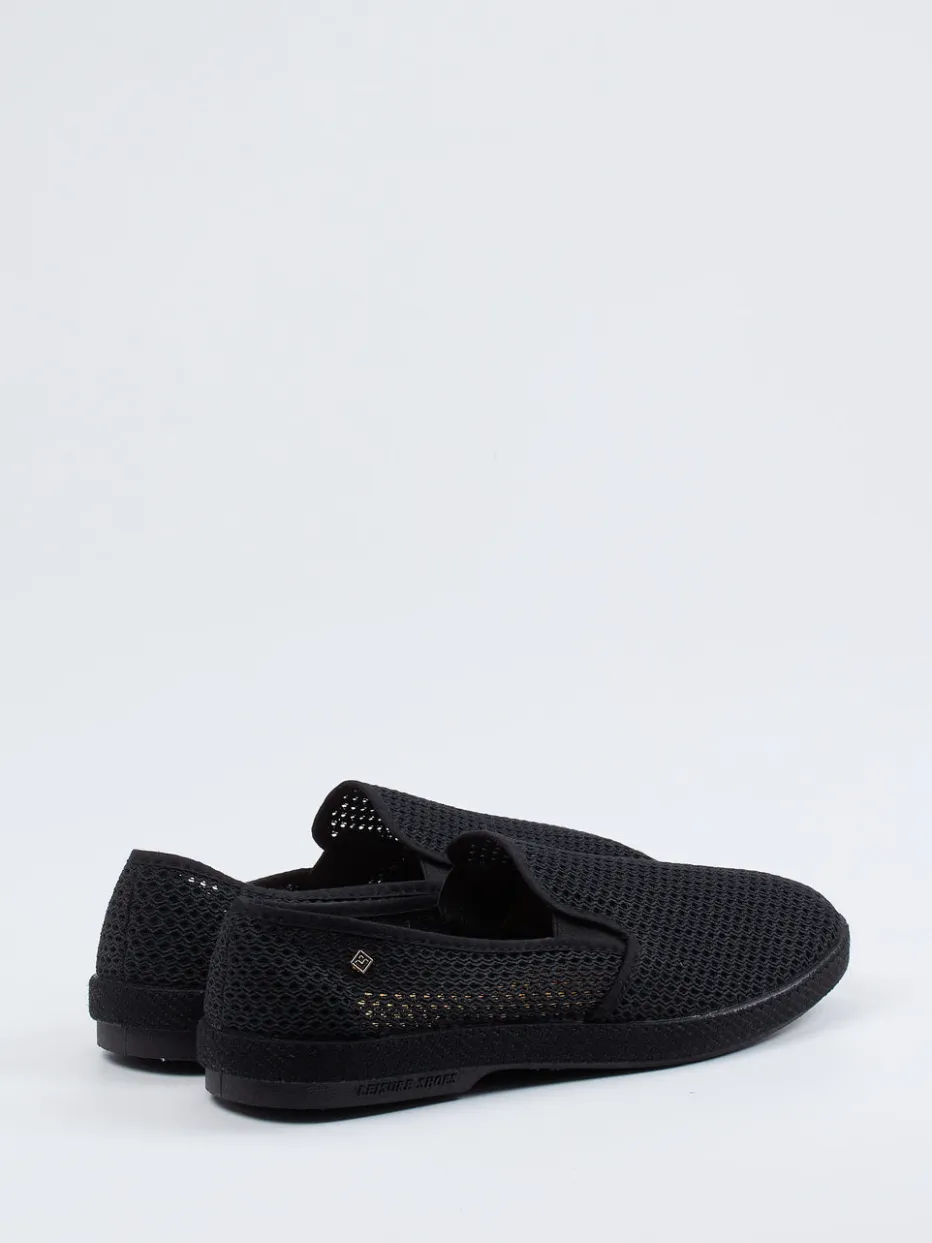 Leichtigkeit im Retro-Stil.Der Slip-On von Rivieras interpretiert den klassischen Espadrille-Look der 50er Jahre neu. Für entspannte Tage, Reisen oder Spaziergänge bei warmem Wetter bietet er ein angenehm leichtes Tragegefühl. Das atmungsaktive Mesh-Textil in tiefem Schwarz ist ton-in-ton verarbeitet und wirkt modern und zeitlos zugleich. Der elastische Einstieg erleichtert das Anziehen, während die perforierte Kunstleder-Innensohle für gute Belüftung sorgt. Die flache Silhouette und die flexible Gummisohle garantieren Komfort – auch barfuß tragbar. Als stilistisch reduziertes Streetwear-Modell passt er bestens zu Shorts oder Leinenhosen. Rivieras liefert lässiges Design mit sommerlicher Bequemlichkeit.