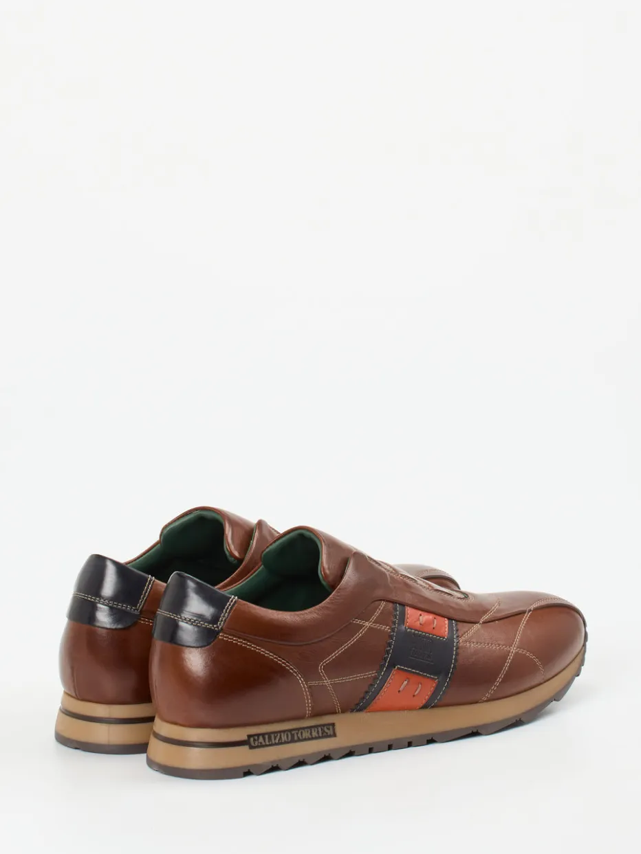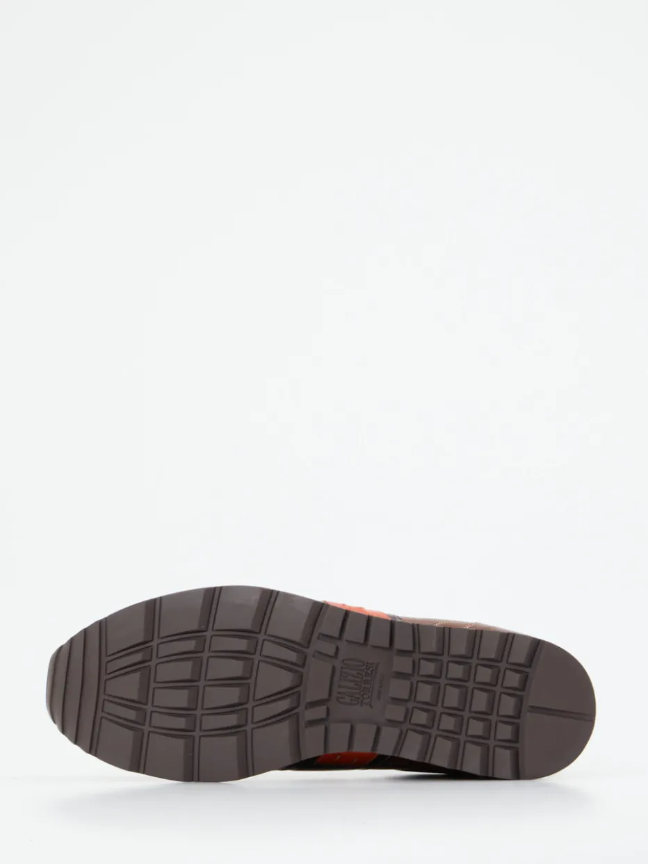 Für dynamische Workdays oder entspannte Freizeitlooks bietet dieser Slip-On dank gepolstertem, herausnehmbarem Fußbett und Elastikeinsätzen maximalen Komfort. Das fein glänzende Kalbleder in Mittelbraun trifft auf kontrastierende schwarze und ziegelorangefarbene Seitenelemente sowie helle Steppnähte – eine stilsichere Verbindung aus Retro-Sportlichkeit und italienischer Handwerkskunst. Die profilierte Gummisohle sorgt für urbanen Halt, das flache Design unterstreicht den zeitgemäßen Charakter. Perfekt zu Chinos oder dunklem Denim im Business-Casual-Kontext.