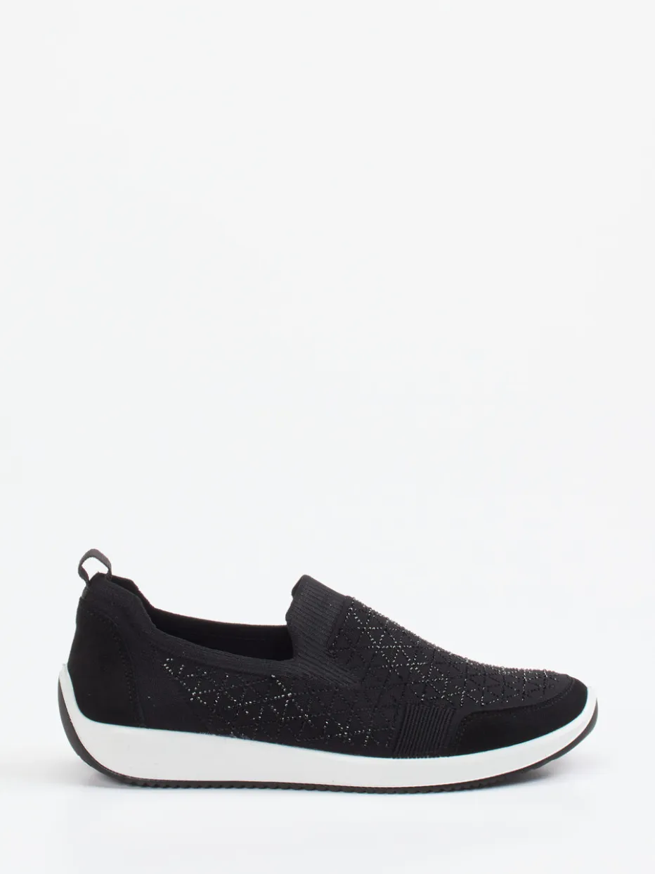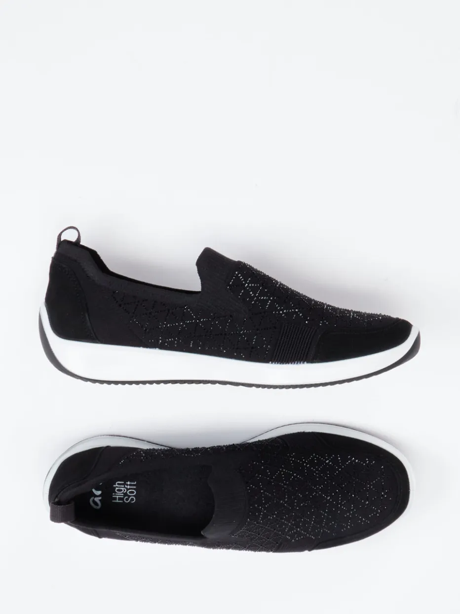 Ara präsentiert einen modernen Slip-On Sneaker für Damen in stilvollem Schwarz mit silberfarbenen Akzenten.