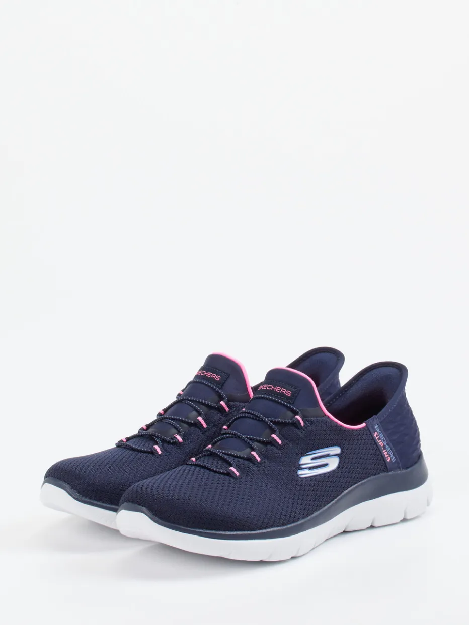 Ideal für Spaziergänge oder lockeres Fitnesstraining bietet das Modell dank strukturiertem Textil-Obermaterial mit Mesh-Anteilen eine hohe Atmungsaktivität. Die dunkelblaue Farbgrundlage wird durch rosa und weiße Akzente im elastischen Schnürsystem und den seitlichen Logo-Details stilvoll aufgelockert. Die flache Silhouette mit gepolstertem Einstieg sowie die rutschhemmende Gummisohle sorgen für ganztägigen Tragekomfort. Der Look passt zu sportlichen Leggings und urbanen Casual-Outfits.