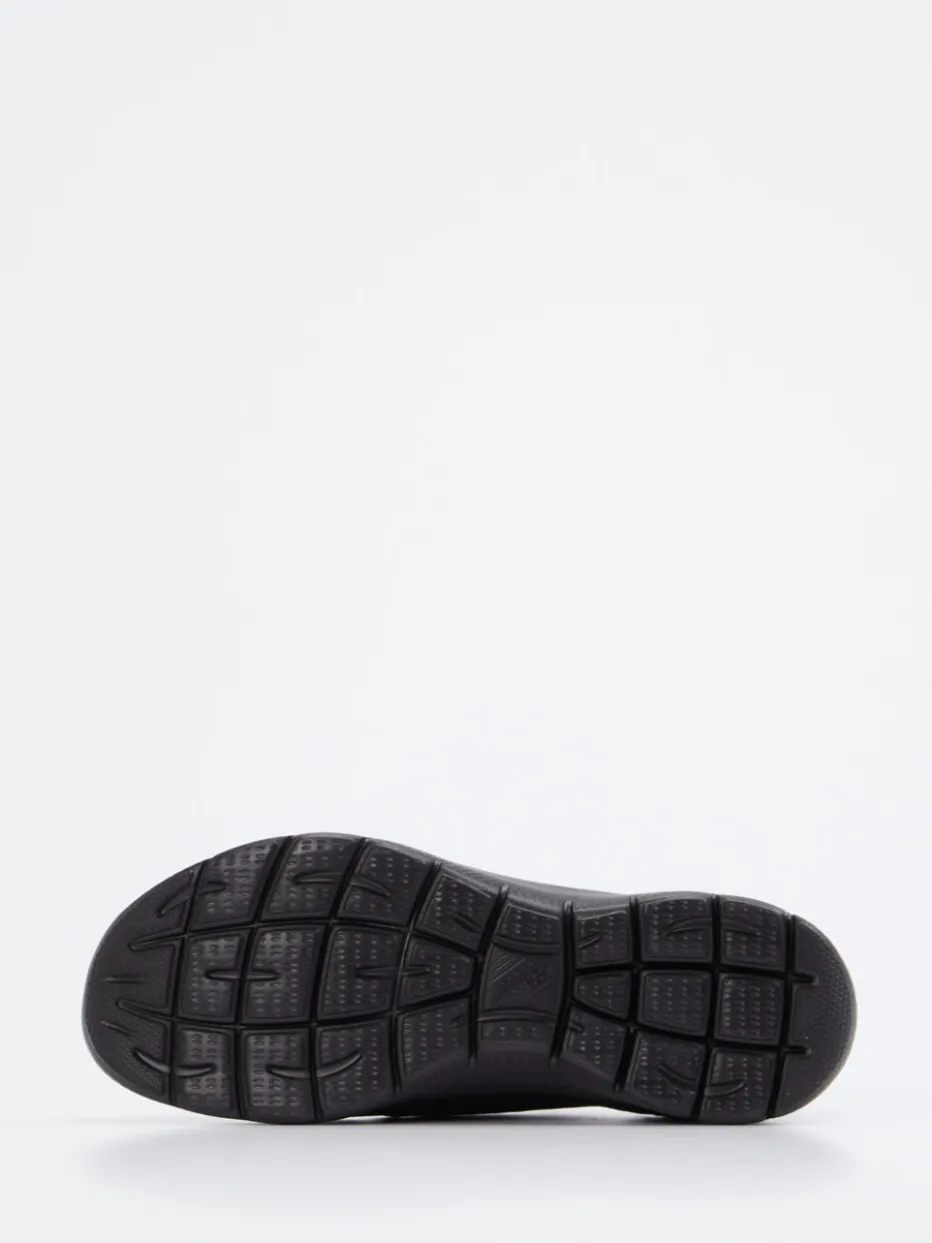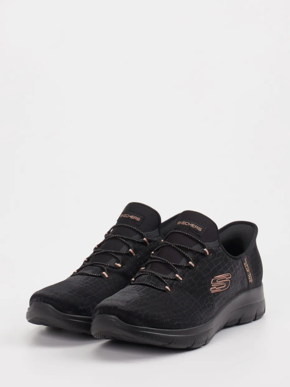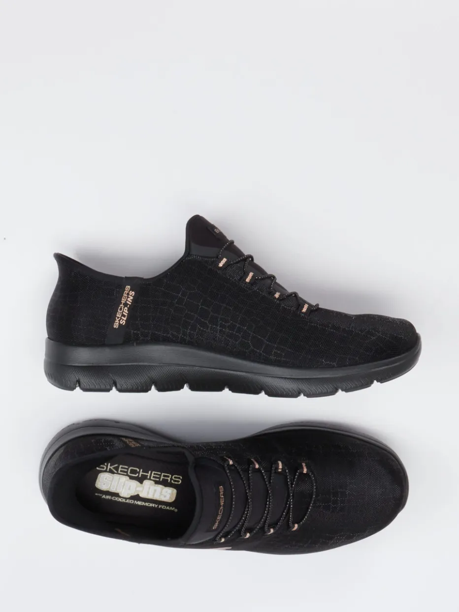 Komfort trifft auf dezente Struktur. Skechers präsentiert mit diesem Damen-Sneaker ein Slip-On-Modell, das durch entspannten Minimalismus überzeugt. Das pflegeleichte Textil-Obermaterial zeigt sich in mattem Schwarz mit feiner Krokoprägung, ergänzt durch kupferfarbene Logo-Details. Die flache, niedrig geschnittene Silhouette wird durch ein elastisches Schnürsystem und einen gepolsterten Einstieg ergänzt. Innen sorgt eine Air-Cooled Memory Foam-Innensohle für besonders angenehmes Laufgefühl – auch auf längeren Wegen. Ideal für Casual-Styles in Freizeit, Alltag oder entspannte Homewear-Outfits. Die profilierte Gummisohle rundet den funktionalen Look sportlich ab. Skechers verbindet modische Bequemlichkeit mit modernem Designanspruch.