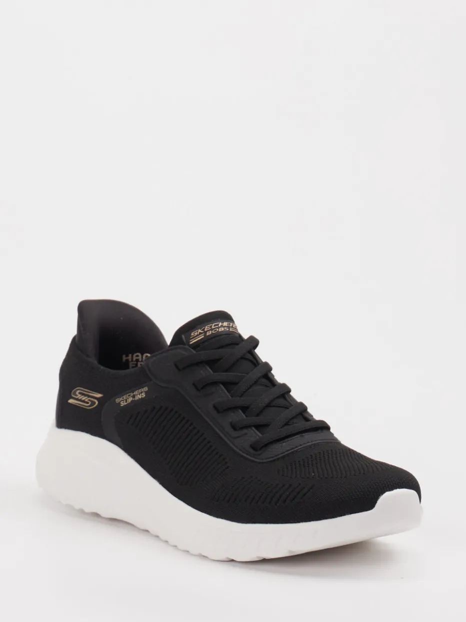 Sportlicher Komfort trifft eleganten Minimalismus. Skechers präsentiert einen modernen Slip-On Sneaker für Damen. Perfekt für schnelle Schritte im Alltag oder leichte Trainingseinheiten: Dieser Sneaker kombiniert ein gestricktes Textil-Obermaterial in Schwarz mit luftdurchlässiger Mesh-Struktur und goldfarbenen Logo-Highlights. Die sportlich geformte Silhouette verfügt über eine elastische Schnürung als Designelement und eine weiße Profilsohle aus Gummi mit rutschhemmender Wirkung. Verstärkte Ferse und gepolsterter Einstieg sorgen für hohen Komfort beim Hineinschlüpfen. Der Look passt zu Sportleggings ebenso wie zu Alltagsoutfits mit lässiger Note. Bequemlichkeit und Funktion vereint in einem alltagstauglichen Design von Skechers.