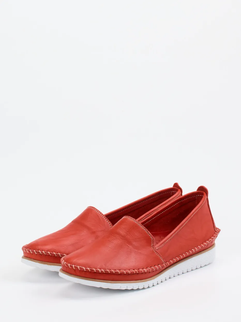 Stilsicher im Sommer unterwegs.Die Marke Andrea Conti präsentiert mit diesem Slipper einen komfortbetonten Damen-Loafer. Ob Stadtbummel oder Gartenfest – das weiche, tomatenrote Kalbleder mit matter Oberfläche passt zu vielen sommerlichen Aktivitäten. Weiße Kontrastnähte und eine profilierte, flexible Gummisohle verleihen dem Schuh eine sportiv-handwerkliche Note. Dank der Schlupfform mit elastischer Einstiegspartie gelingt das Anziehen mühelos. Optisch schlicht gehalten, fügt er sich hervorragend in einen minimalistischen, casual Look ein. Ideal kombinierbar mit Leinenblusen oder leichten Sommerhosen. Ein stilvoller Freizeitschuh mit komfortorientiertem Design von Andrea Conti.
