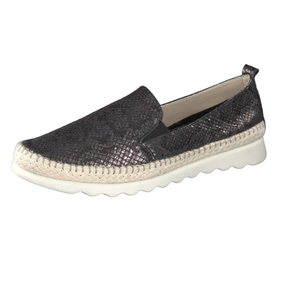Leichtfüßig durch urbane Sommertage.Der Damen-Slipper von The Flexx präsentiert sich im klassischen Espadrille-Stil. Dank geprägtem Leder mit Schlangenhautstruktur und Metallic-Finish vereint das Modell „Chappie“ stilvolle Exotik mit modernem Glanz. Das glänzende Obermaterial in Anthrazit wirkt mit der geflochtenen Juteumrandung und der flexiblen Gummisohle besonders sommerlich. Zwei seitliche Elastikeinsätze sorgen für angenehmen Halt, während das weiche Fußbett den Komfort hebelt. Minimalistische Formen treffen auf Streetstyle-Akzente – ideal für stilbewusste Genießerinnen mit Sinn für Trends. Kombiniert mit Leinenhose oder Strandtasche entfaltet sich eine lässig-elegante Wirkung. Leicht, komfortabel und mit dezentem Luxus – typisch The Flexx.