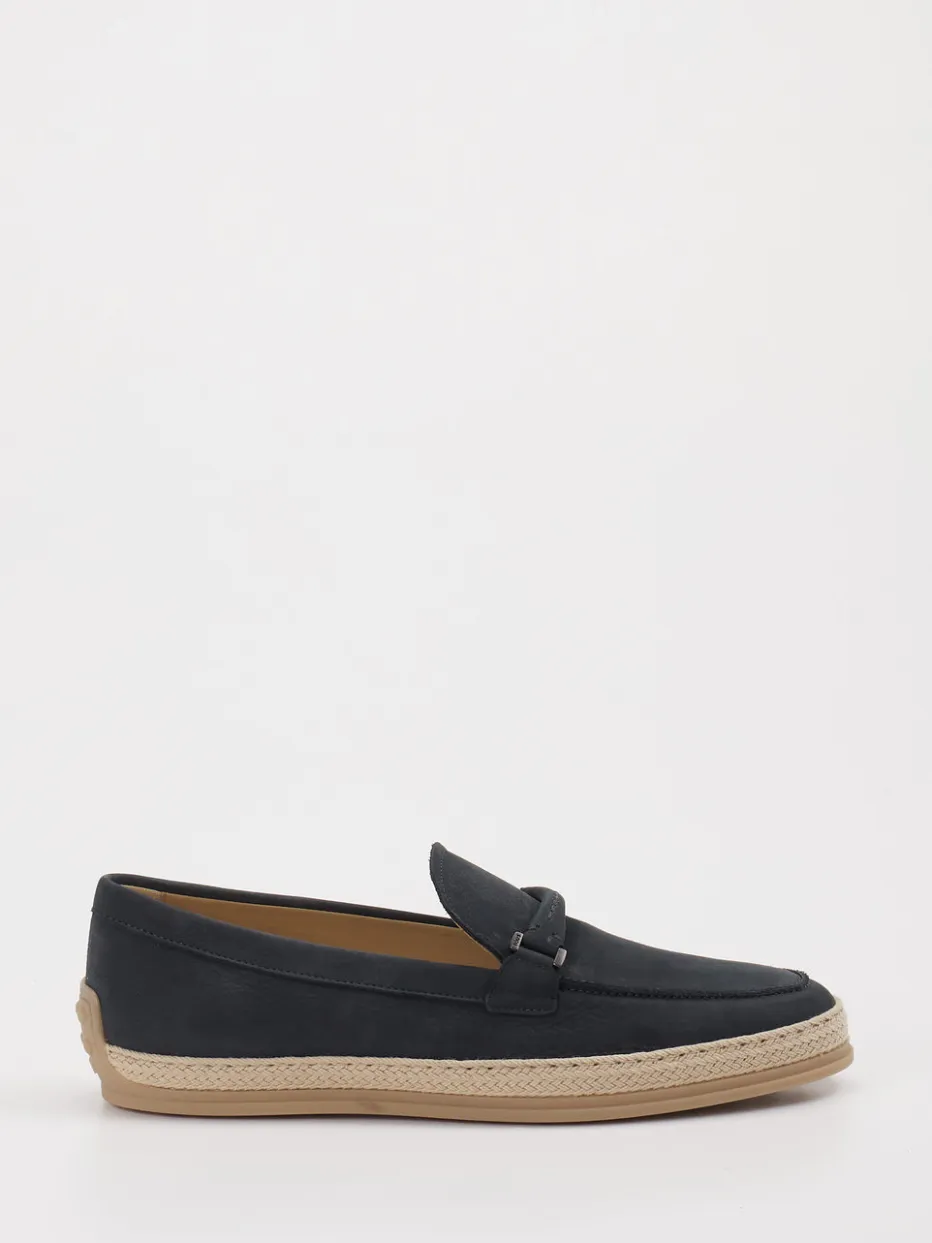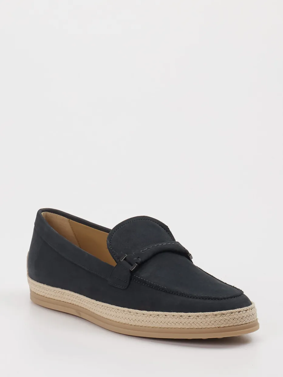 Italienische Lässigkeit für warme Tage. Tod’s präsentiert einen maskulinen Slipper mit entspannter Eleganz. Ideal für Urlaub oder City-Walks bei sommerlichen Temperaturen: Das Modell aus glattem Nubukleder zeigt sich in dunklem Blau mit mattem Finish und Bastumrandung. Die flache Silhouette, der betonte Zier-Riemen mit Metallakzent sowie die strukturierte Gummisohle unterstreichen die entspannte Raffinesse. Mediterranes Design trifft auf casual Tailoring – perfekt kombinierbar mit Leinenhemd oder Chino. Markentypische Qualität und dezente Detailarbeit sorgen für ein angenehmes Tragegefühl mit stilsicherem Auftritt.