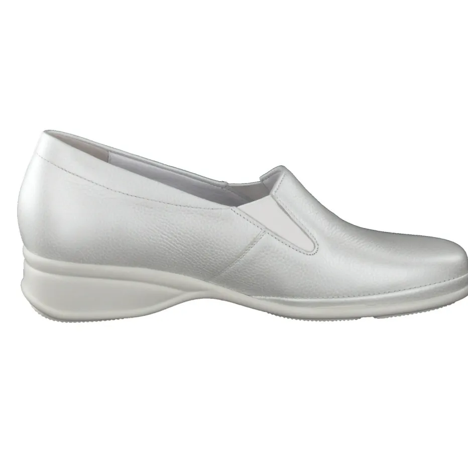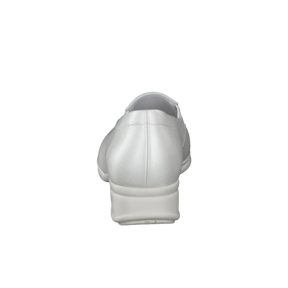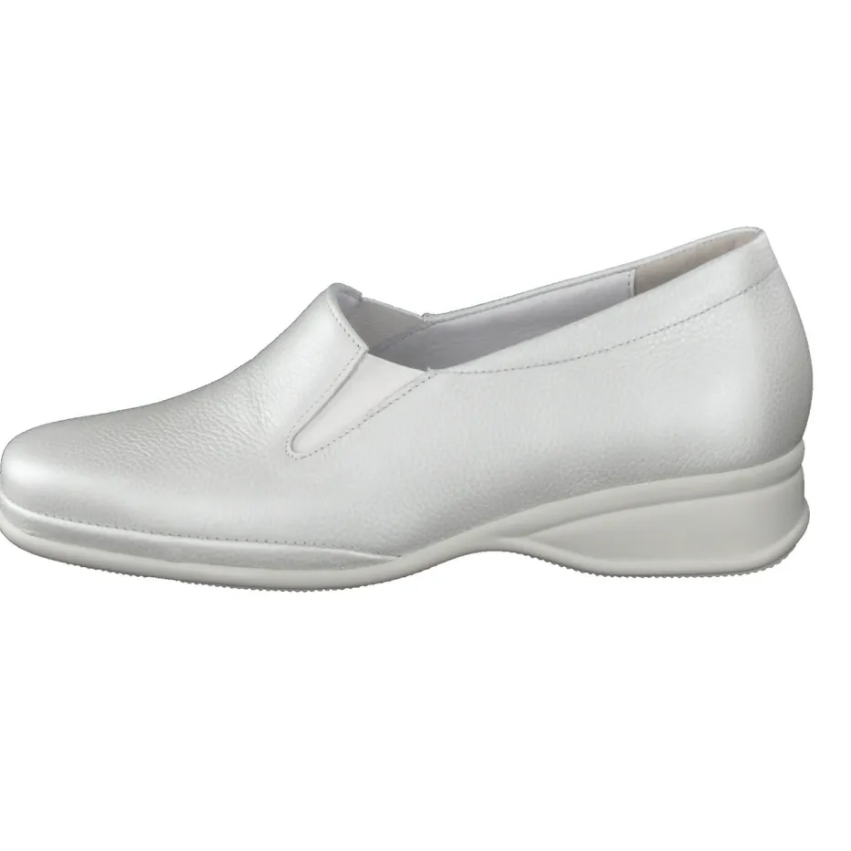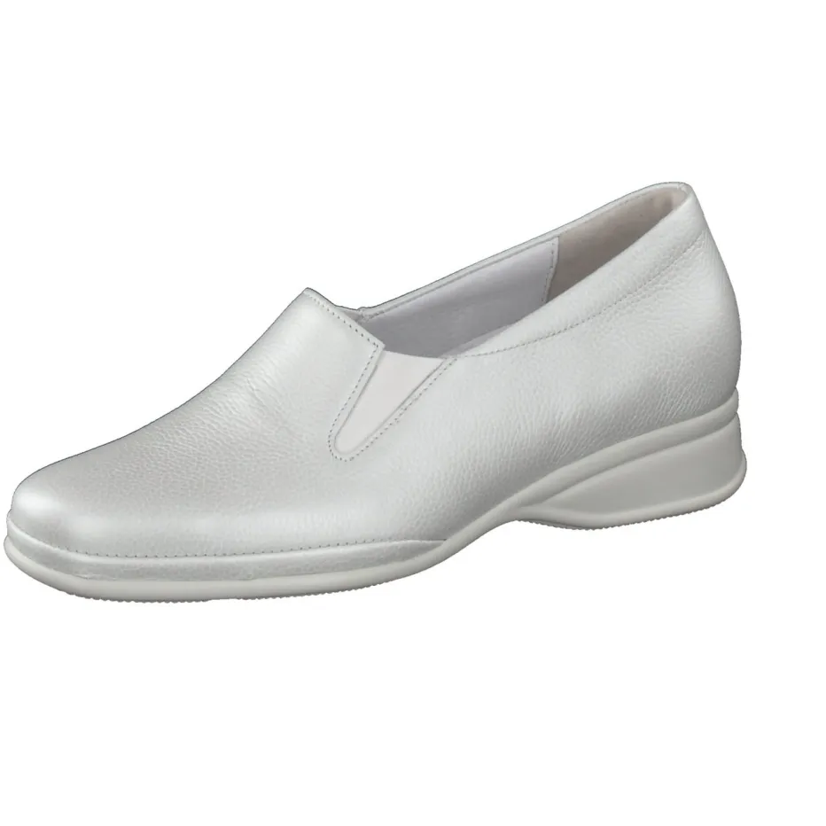 Schimmernde Leichtigkeit für jeden Tag.Semler zeigt hier einen Damen-Slipper im Komfortsegment. Für entspannte Stunden zu Hause oder stilvolle Erledigungen im Alltag: Das aus weißem Metallicleder gefertigte Modell kombiniert genarbte Oberfläche mit dezentem Glanz. Elastikeinsätze in Ton-in-Ton erlauben leichtes Hineinschlüpfen, die klassische abgerundete Form unterstreicht den reduzierten Look. Die stoßdämpfende PU-Luftpolstersohle wirkt entlastend und gibt guten Halt. Mit herausnehmbarem, lederbezogenem Fußbett auch für Einlagen geeignet. Ideal zu weiten Stoffhosen oder Ton-in-Ton-Looks in Pastell. Semler steht hier für durchdachten Komfort und zurückhaltende Eleganz mit funktionalem Anspruch.