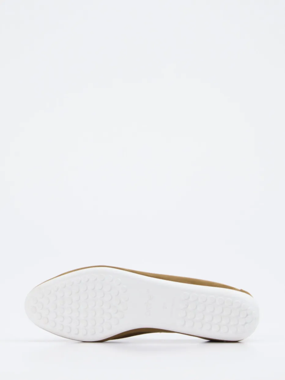 Für entspannte Sommertage im Alltag eignet sich dieser cognacbraune Slipper aus samtig angeschliffenem Nubukleder mit mattem Finish. Das perforierte Blatt sorgt für angenehme Fußbelüftung, während die elastische Fersenkante den Einstieg erleichtert. Mit weißer Kautschuksohle samt Noppenprofil unterstreicht der flach und schmal geformte Loafer seinen Casual-Charakter. Dezent gehaltene Nähte und das schnörkellose Design fügen sich perfekt in die Trendlinien „Quiet Luxury“ und „Soft Neutrals“ der Saison ein. Kombiniert zu weiter Sommerhose und minimalistischer Crossbody-Bag entsteht ein stilsicherer Look.