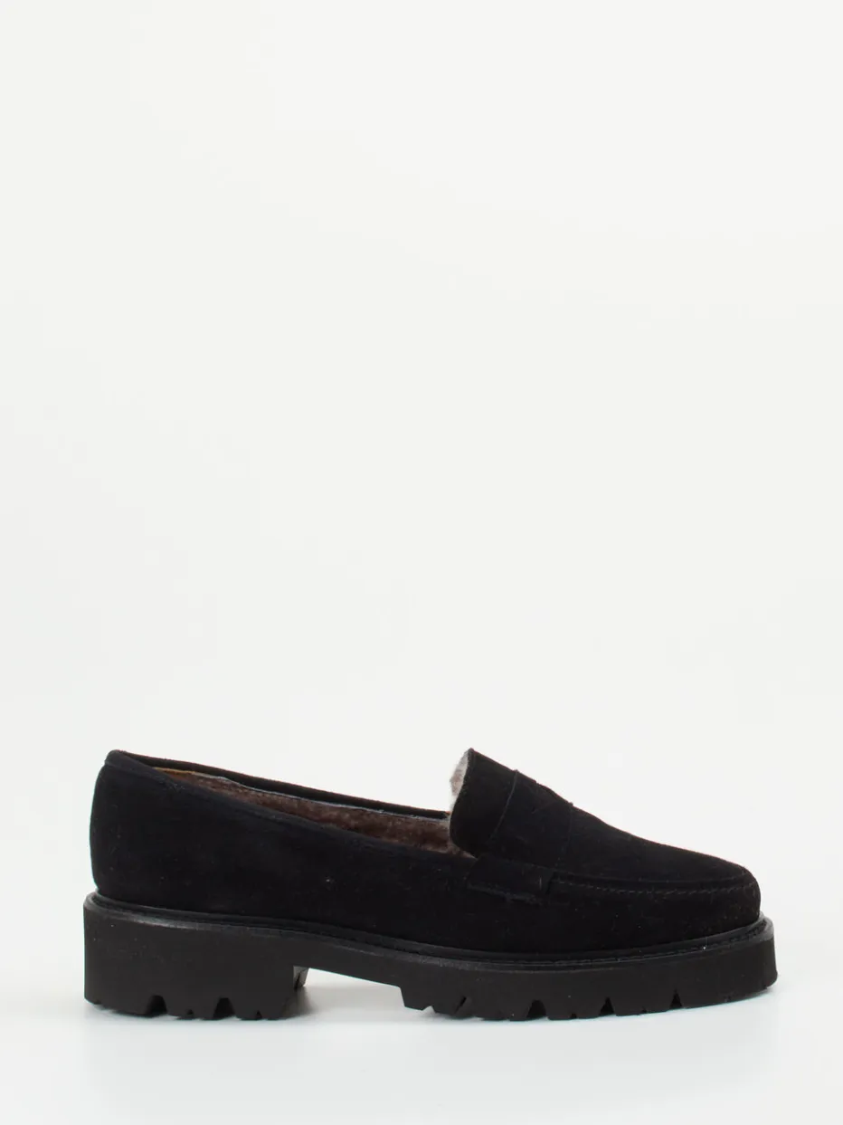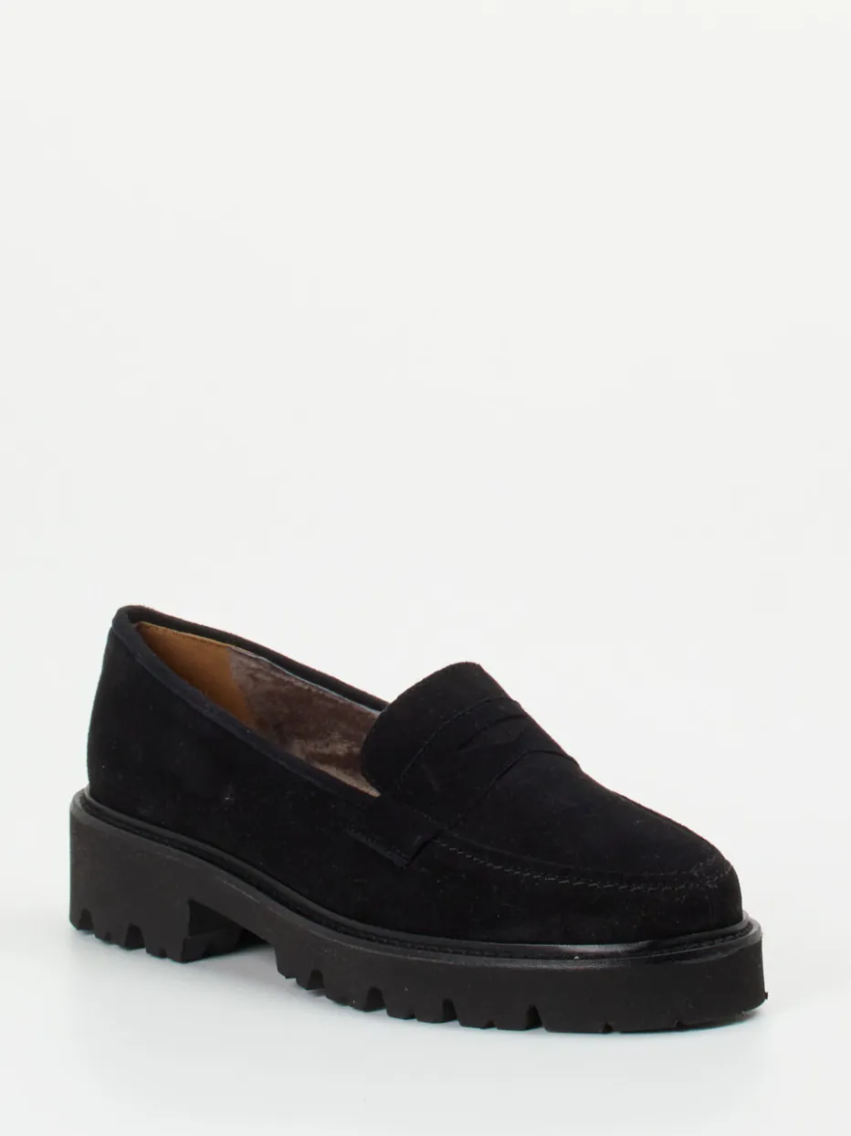 Der gefütterte Slipper von Mannori verbindet hochwertiges Veloursleder mit wintertauglichem Komfort. Die markante Profilsohle ergänzt das minimalistische Design auf stilvolle Weise.