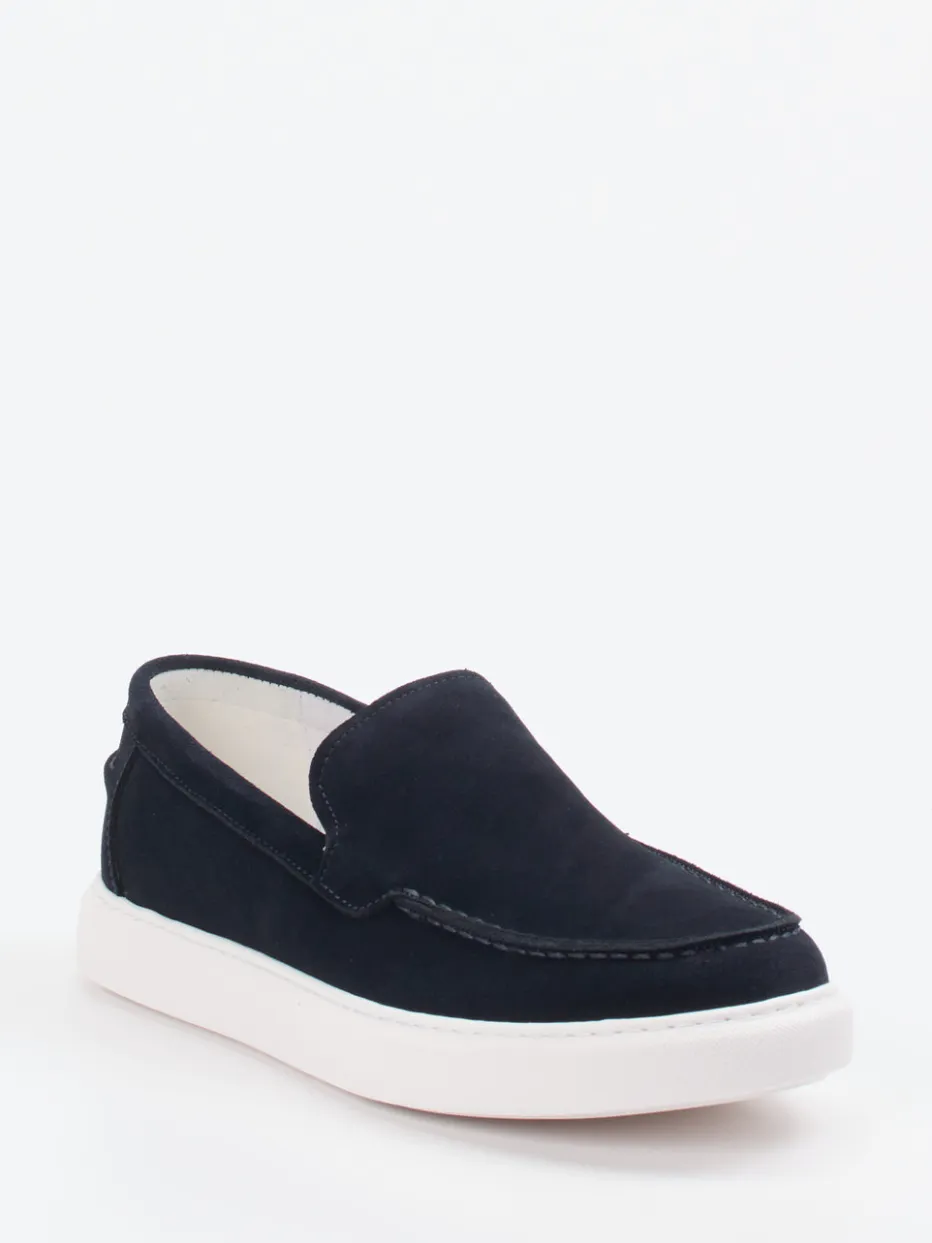 Schlicht. Sportlich. Stilvoll.Daniel Kenneth zeigt mit diesem Herren-Slipper ein Modell, das sportiven Komfort mit dezenter Eleganz verbindet. Ideal für den Alltag oder das Büro: Der flach geschnittene Loafer-Sneaker-Hybrid aus samtig angeschliffenem Veloursleder in Dunkelblau wirkt durch klare Linienführung und tonale Nähte angenehm reduziert. Ein Elastikeinsatz erleichtert den Einstieg, während die flexible, weiße Gummisohle mit feinem Rillenprofil für Trittsicherheit sorgt. Innen wurde ein Kalbleder-beschichtetes Wechselfußbett verarbeitet – auch barfuß besonders angenehm. Der Look folgt zeitgenössischem „Quiet Luxury“ und passt zu Chino, Denim oder smarten Freizeit-Kombis. Reduziert im Design, überzeugend vielseitig für anspruchsvollen Komfort.