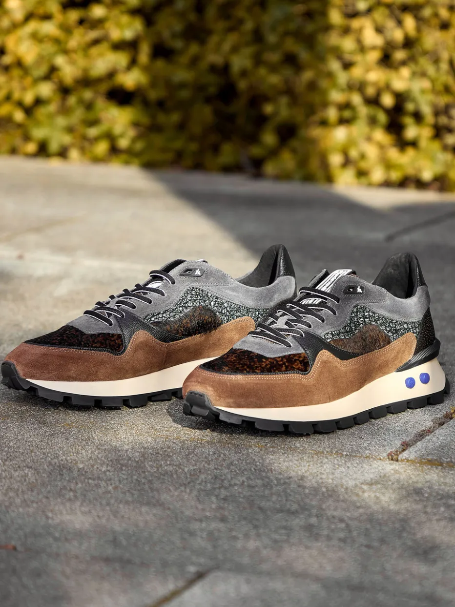 Statement für starke Streetwear-Styles.Floris van Bommel bietet mit diesem Herren-Sneaker ein markantes Modell der urban-sportiven Kategorie. Der Materialmix aus Fell, samtig angerautem Veloursleder, Mesh und Glattleder verleiht diesem Sneaker seinen außergewöhnlichen Look. Anthrazitgrau und Mittelbraun schaffen im Zusammenspiel mit schwarzen Akzenten und einer ausgestellten Chunky-Silhouette ein kontrastreiches Designbild. Reflektierende Elemente, kontrastierende Schnürsenkel und eine grob profilierte Gummisohle mit Outdoor-Anspruch unterstreichen den Gorpcore-Trend mit funktionaler Note. Der gepolsterte Schaft, das Kalblederfutter und das herausnehmbare Fußbett sorgen für Komfort im urbanen Alltag. Perfekt für stilbewusste Männer mit Affinität zu Materialkontrasten und progressivem Design.