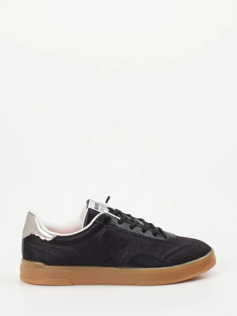 Für urbane Looks mit Profil bietet das Paar einen raffinierten Materialmix aus schwarzem Fellimitat mit strukturierter Ponyfell-Optik und Glattleder-Details. Die schalenförmige Gummisohle in Hellbraun sorgt für einen klaren Kontrast, während das silberfarbene Metallic-Fersenelement den Streetwear-Faktor unterstreicht. Der gepolsterte Einstieg und das atmungsaktive Textilfutter erhöhen den Komfort – auch mit Einlagen tragbar. Im Trend mit der „Materialmix AW24“-Ästhetik und Retro-Court-Anklängen funktioniert dieser Sneaker besonders gut zu Oversized Hoodies oder monochromen Outfits.